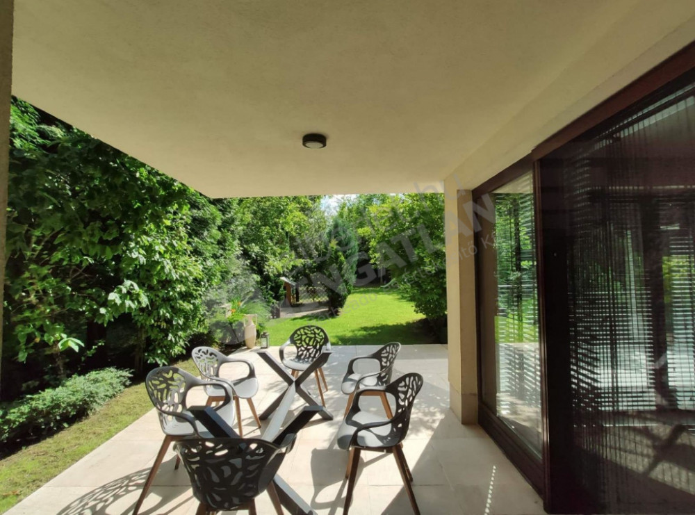 1000m2-es telek, gondozott kert automata öntözőrendszerrel és halastóval.