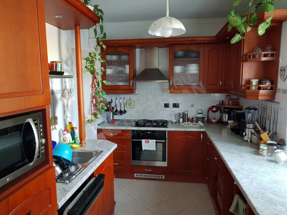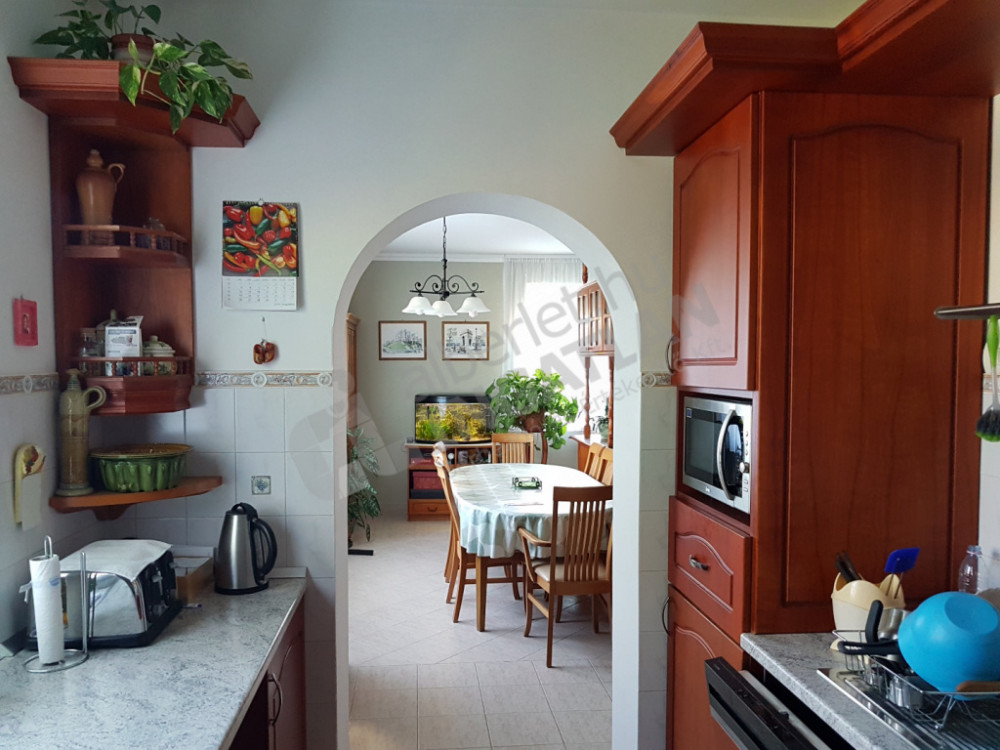 Konyha konyhabútorral, gáztűzhellyel, sütővel, mikróval, hűtővel, kamra, étkező
