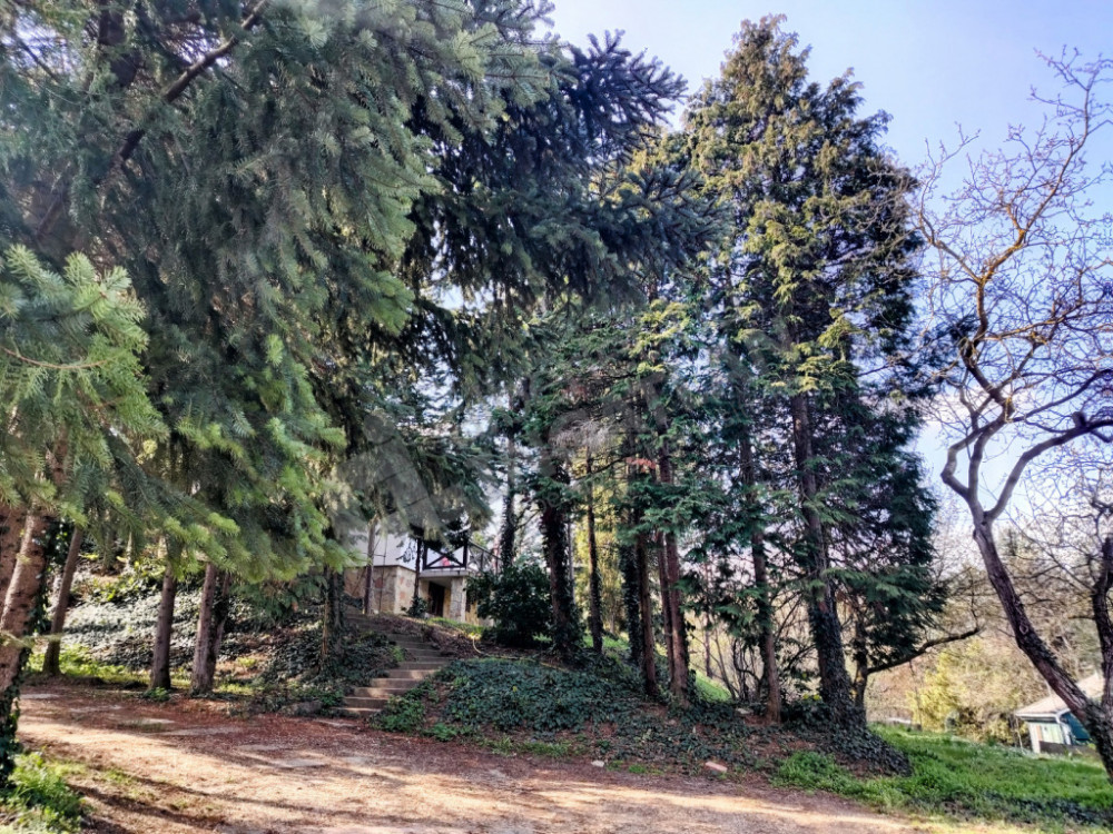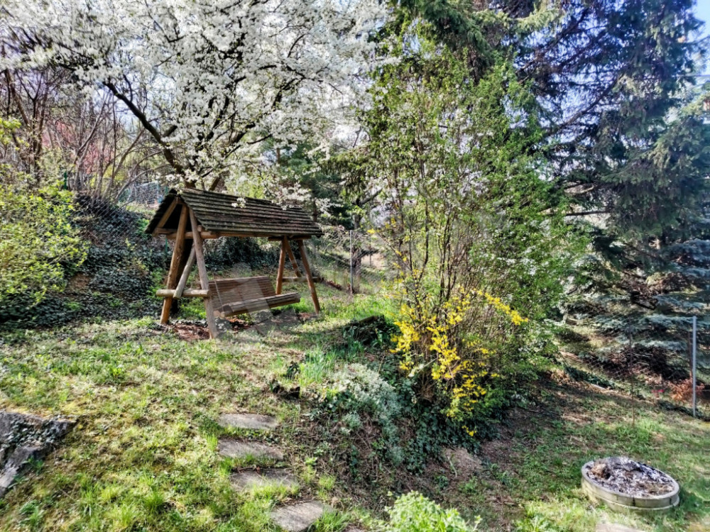 Az 1000 nm telken fenyő és gyümölcsfák, valamint garázs és fészer van.