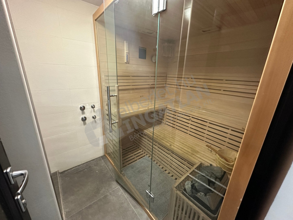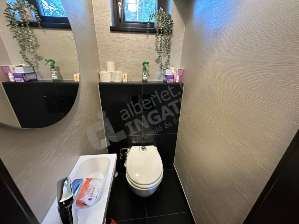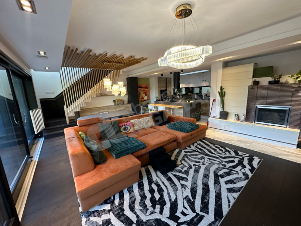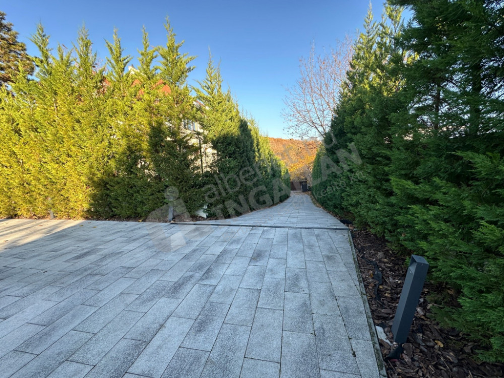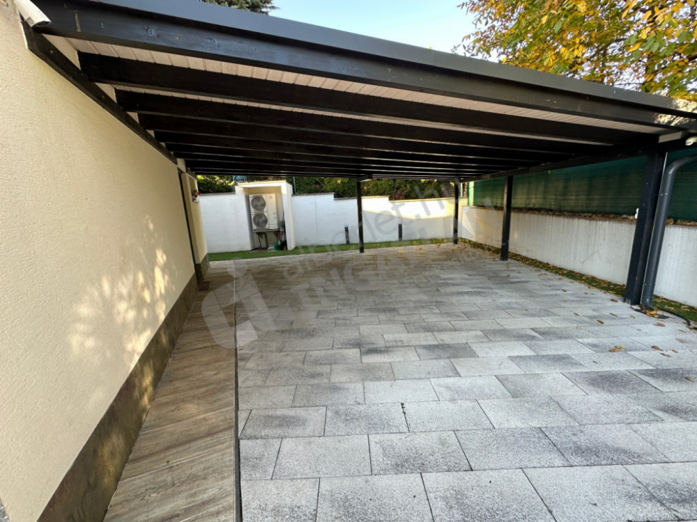 Négy hálószoba, tágas nappali-konyha, két fürdőszoba, két külön WC, óriási panorámás tetőterasz, fedett, két állásos autóbeálló, tárolóhelyiségek, szauna, díszkert.