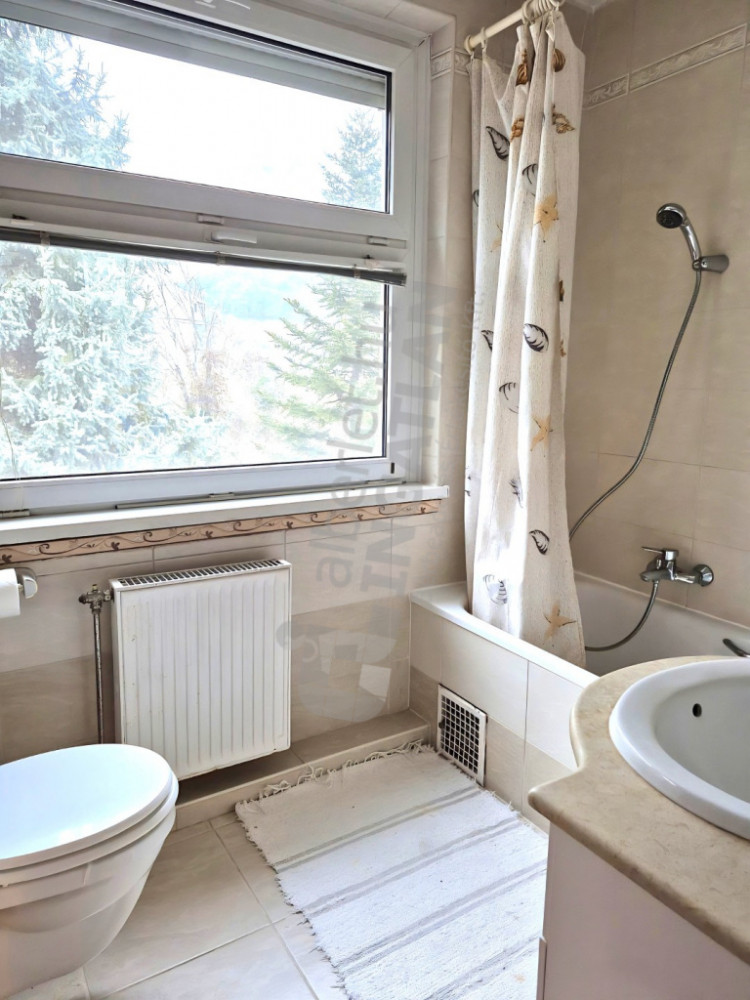A házban 2 fürdőszoba (zuhanyzó és kád), 2 WC, gardrób, hall és több tároló biztosítja a kényelmet. A fűtést és a meleg vizet cirkó kazán adja, a hőérzetet pedig klíma is támogatja.