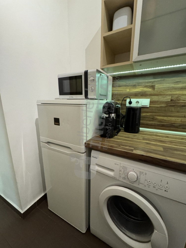 -4 nm-es, gépesített konyha kombihűtővel, mikróval, tűzhellyel, sütővel, mosógéppel és kávéfőzővel