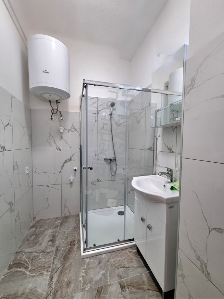 A gépesített, ablakos konyha praktikus és barátságos. A fürdőszoba zuhanyzós, a WC külön helyiségben található.