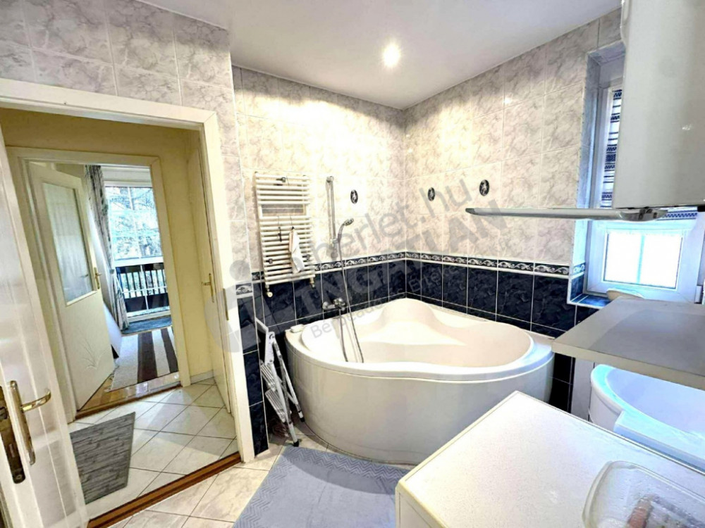 A fürdőszoba nagy sarak-káddal rendelkezik, a WC külön helyiségben található.
