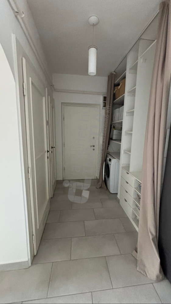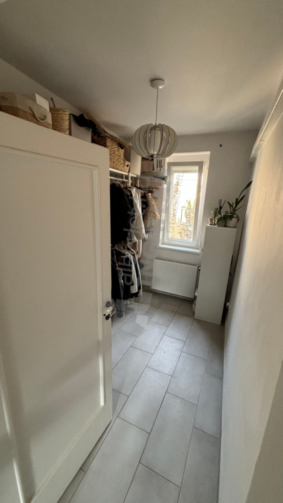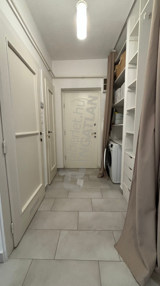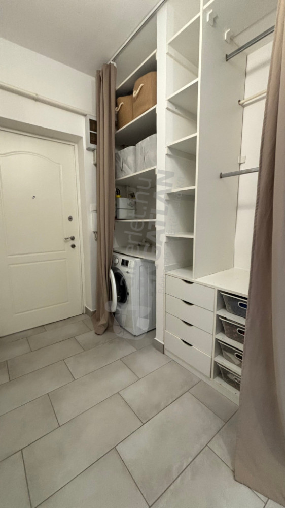 Az előszobában beépített gardróbszekrény segíti a tárolást és egy szárítós mosógép is el lett helyezve.