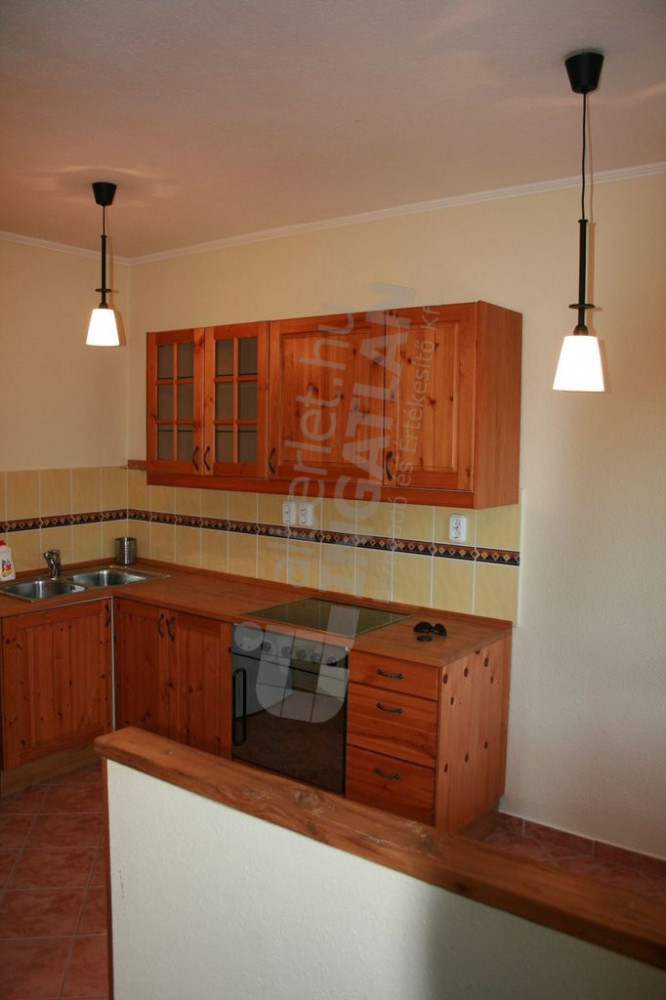 Felszerelt konyha és fürdőszoba a konyhában: kerámialapos villanytűzhely, konyhaszekrény, hűtő- és fagyasztószekrény, a fürdőben mosógép található.
