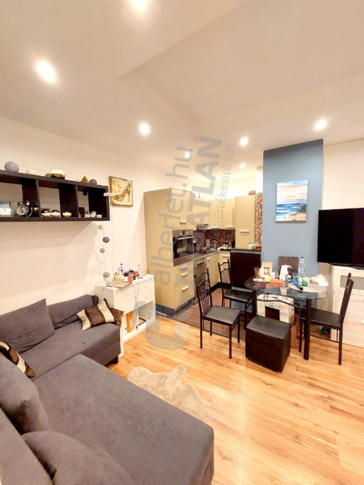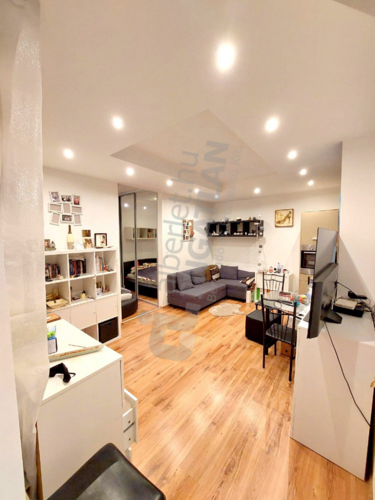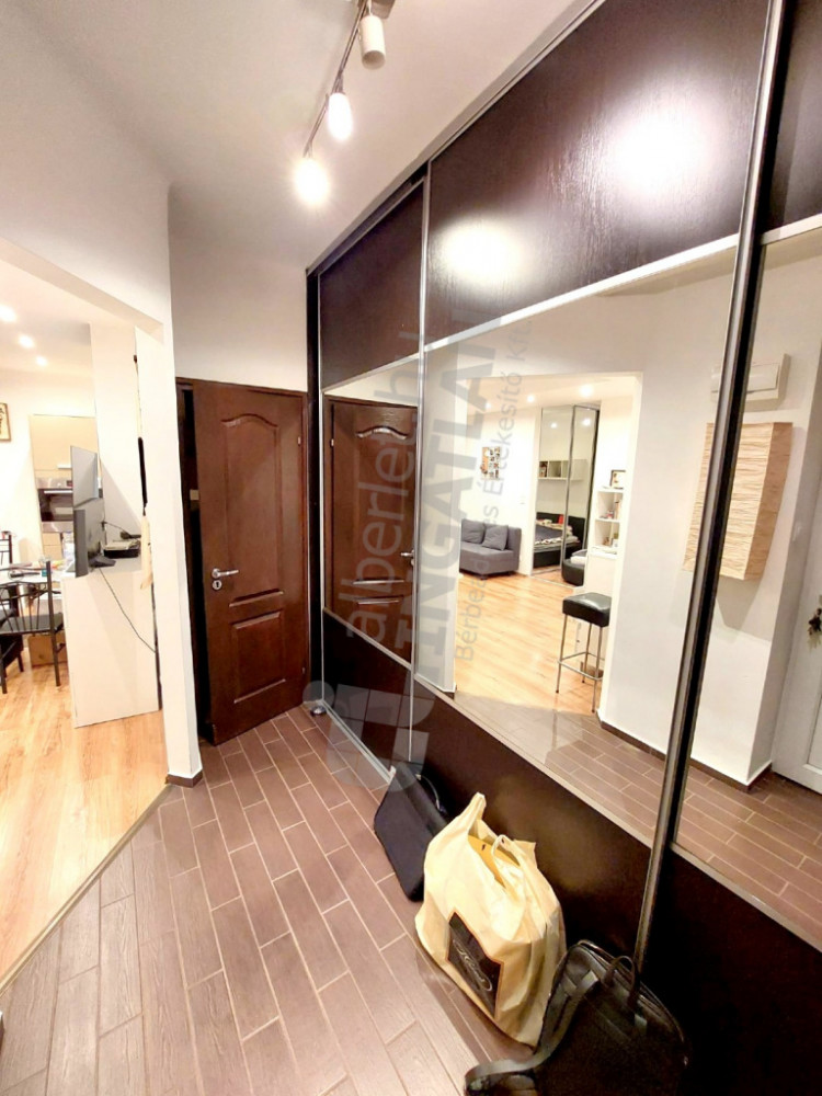 Amerikai konyhás nappali, külön hálószoba és sarokkádas fürdőszoba tartozik hozzá. Teljesen bútorozott és gépesített (mosogatógép, sütő, főzőlap, mikrohullámú sütő). Meleg víz elektromos bojlerrel, fűtés központi kazánról.