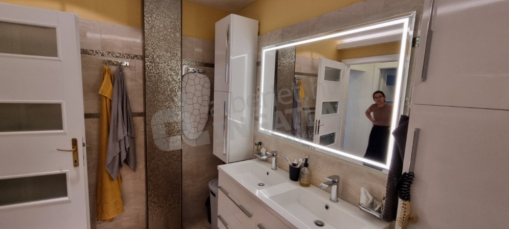 A fürdőszobában dupla mosdó és új LG mosó-szárítógép található.