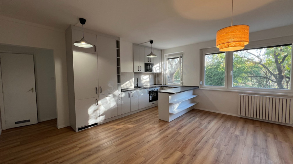 Kiadó Budapesten a III. kerületben a Lőpormalom utcában, egy magasföldszint, parkos utcára néző, 46 m2-es, lakás.