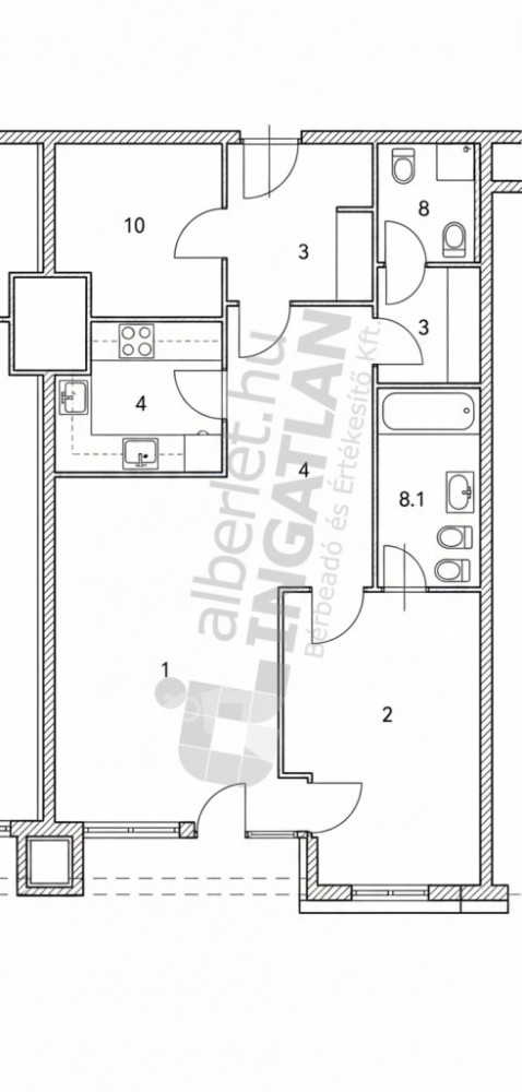 Amerikai konyhás nappali, hálószoba saját fürdővel, egy gardróbszobának/dolgozónak használható kisebb félszoba, külön zuhanyzós fürdő/WC, mosókonyha.