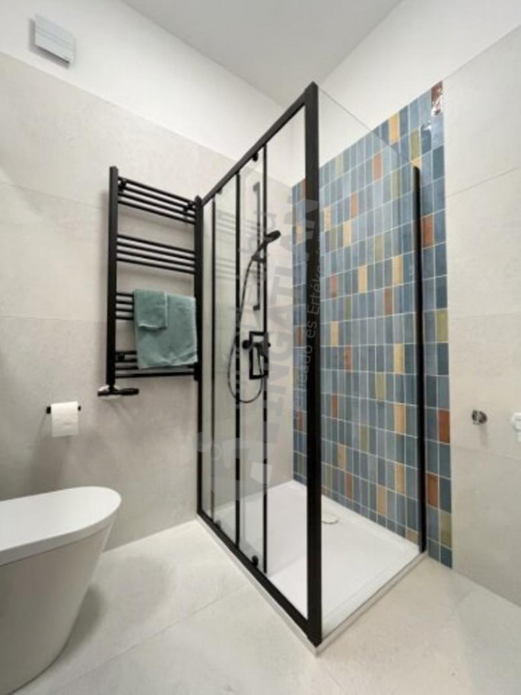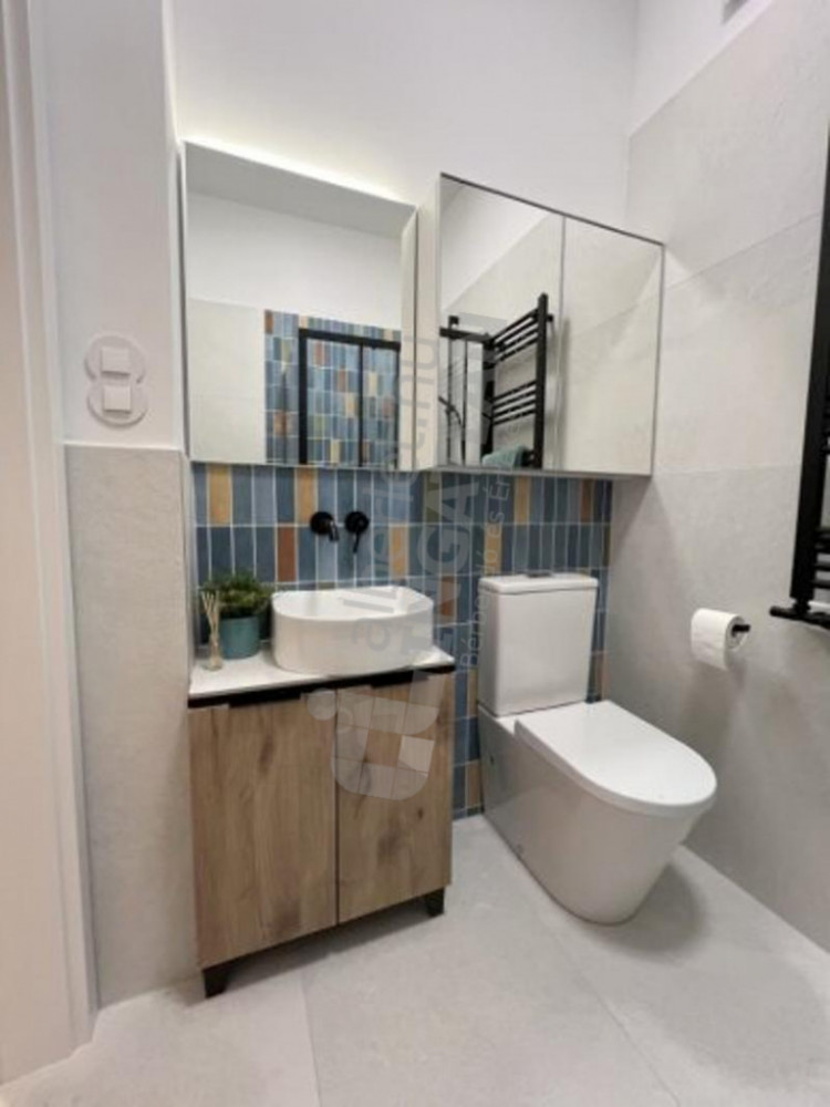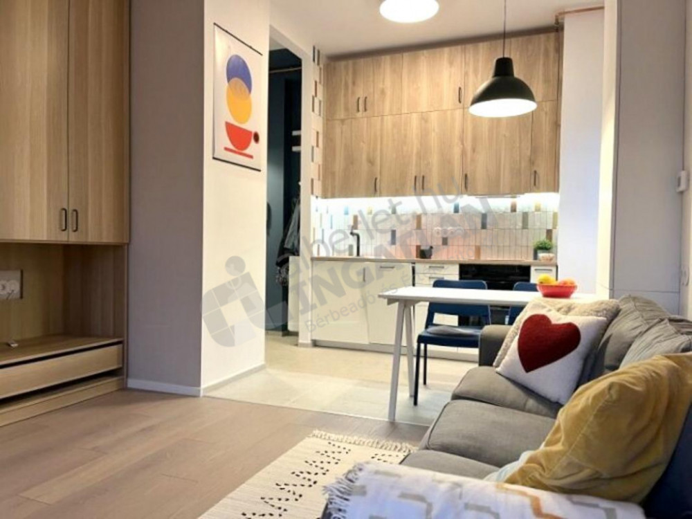 A lakás modern, új konyhabútorral és gépekkel felszerelt, a fürdőszoba pedig esztétikus és igényesen kialakított.
