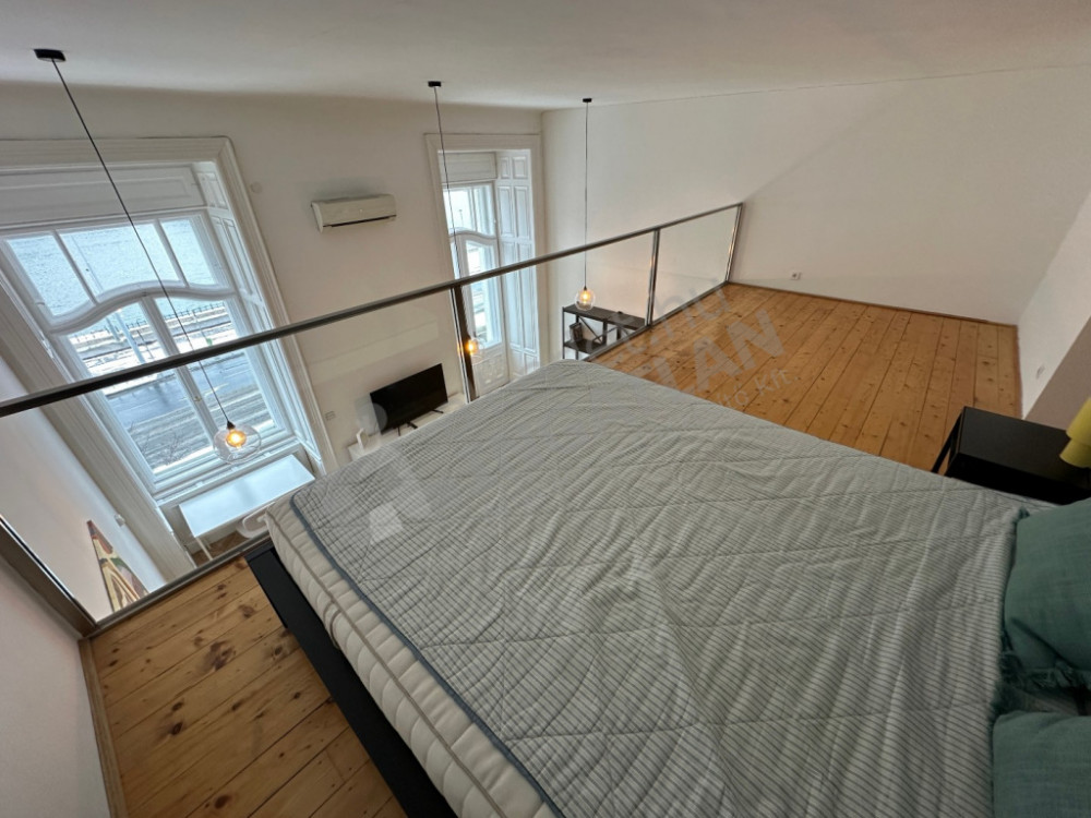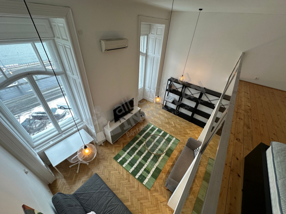Belgrád rakparton kiadó egy 59 m2-es (+30 m2-es galéria) dunai örökpanorámás lakás. Hatalmas, világos nappali, tágas galéria, két fürdőszoba.