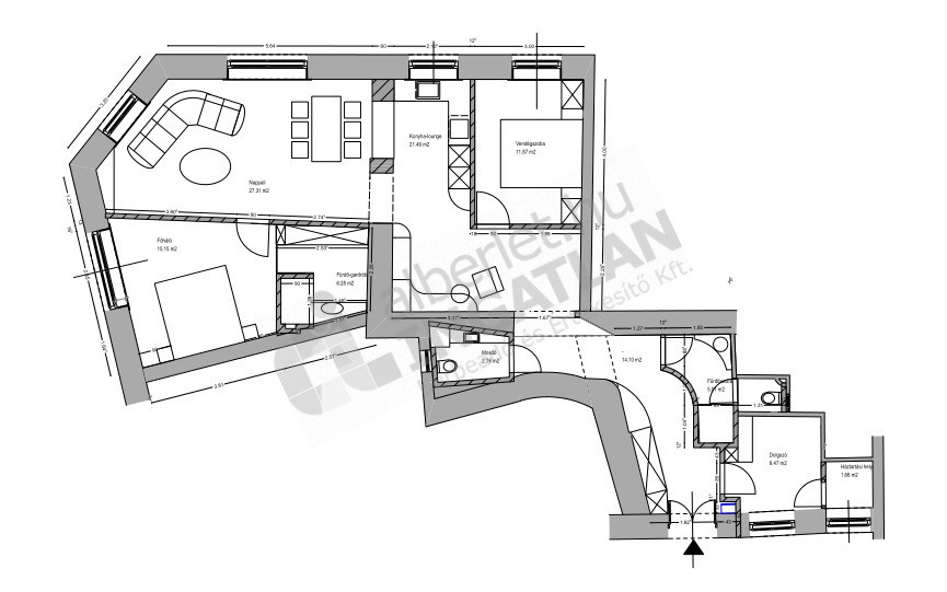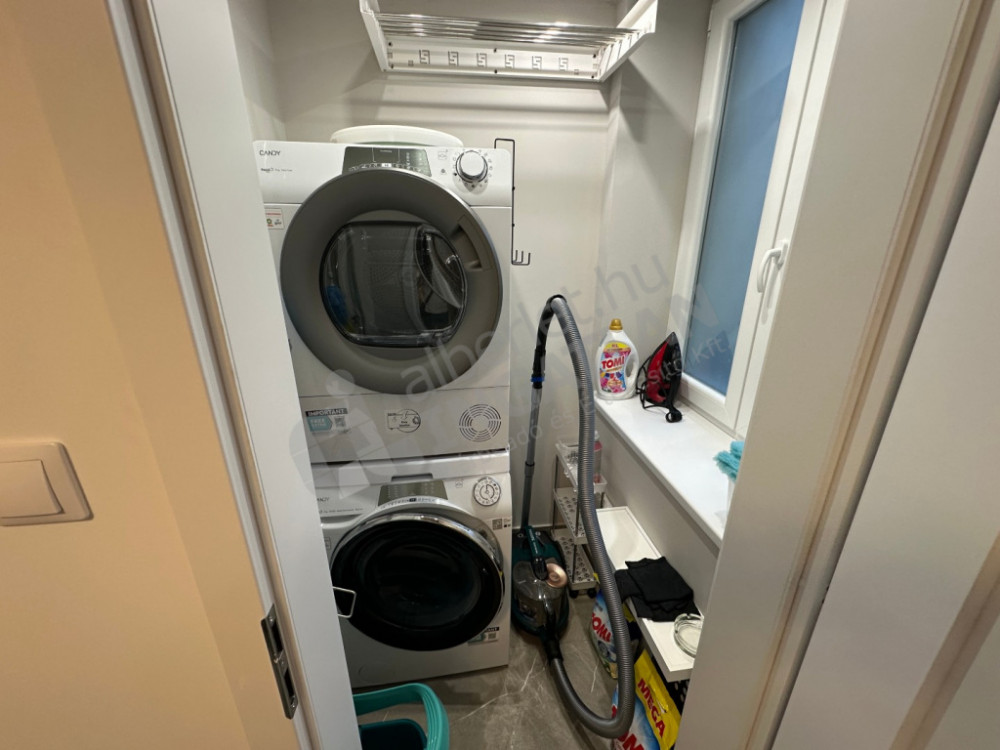 Két hálószoba, külön dolgozószoba, amerikai konyhás nappali/étkező, két fürdőszoba, külön WC, mosókonyha.