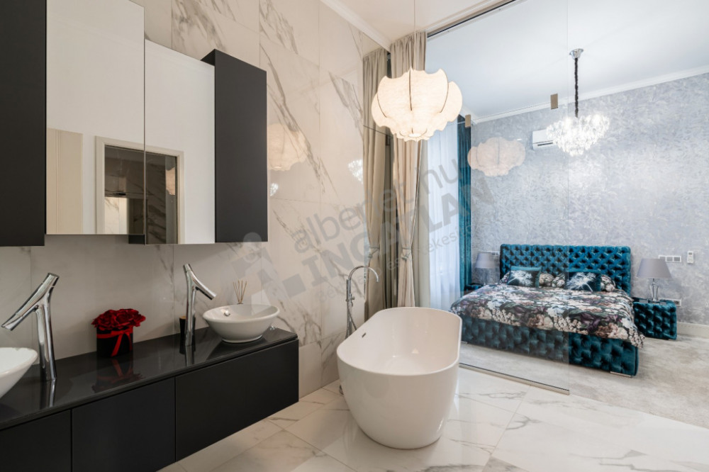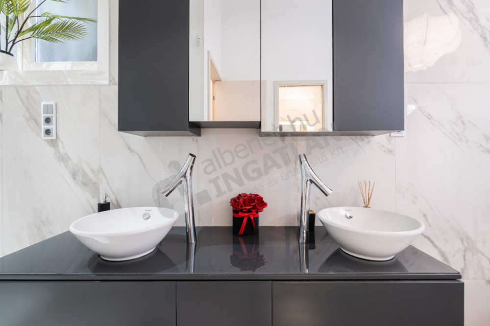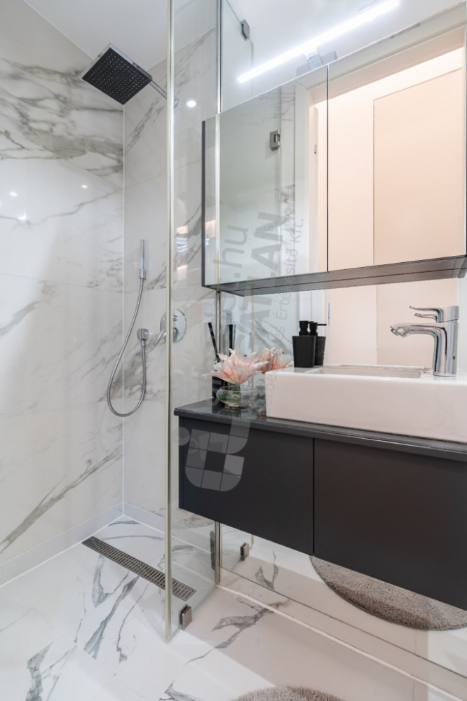 Amerikai konyhás, világos nappali, két fürdőszoba – az egyiket üvegfal választja el az egyik hálószobától, a másik külön fürdőszoba tusolóval.
