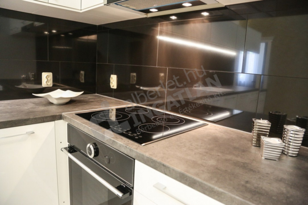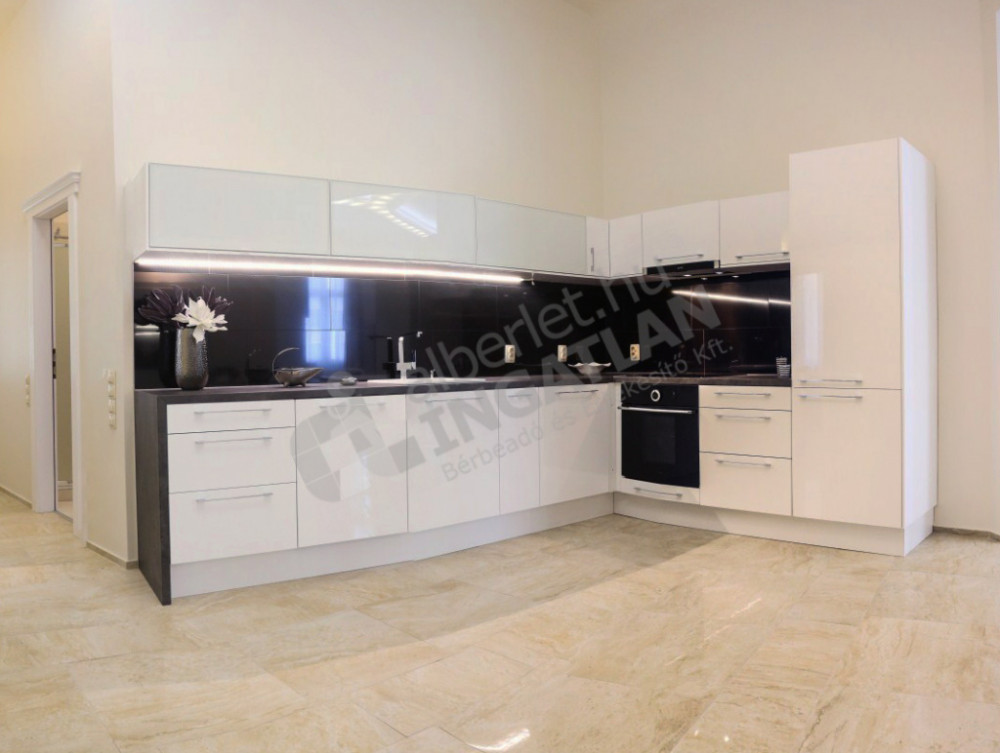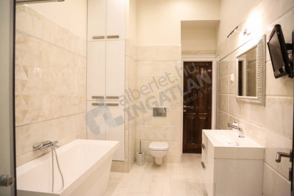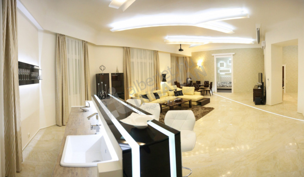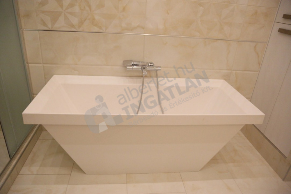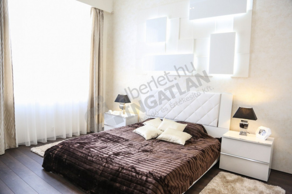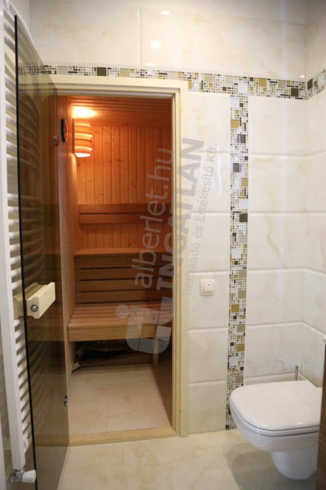 Az extrák közé tartoznak a távirányítású motoros redőnyök. A nappaliban helyet kapott egy bárpult beépített hűtővel, mosogatóval. A lakáshoz 3 fürdőszoba tartozik finn szaunával, márvány kád teszi még kifinomultabbá a formák összhangját.