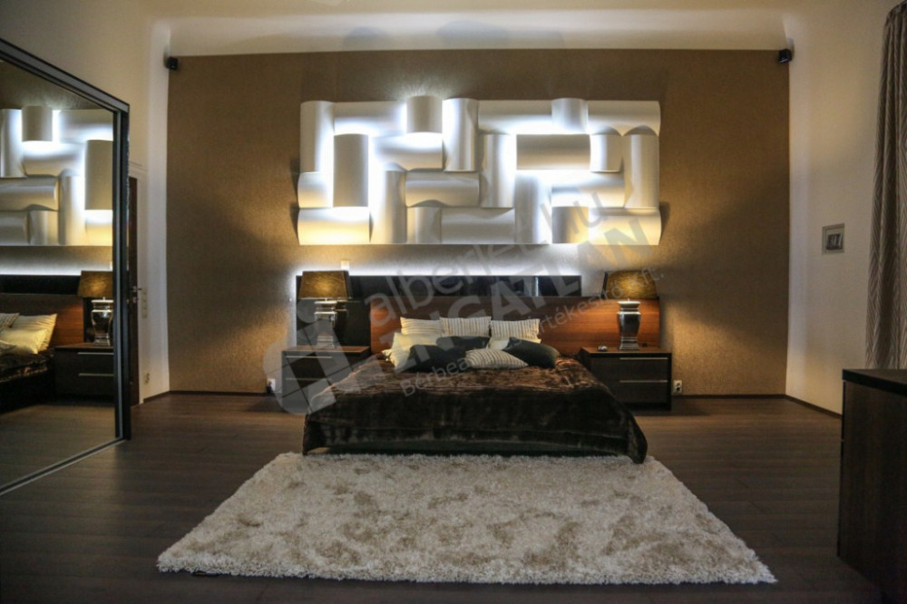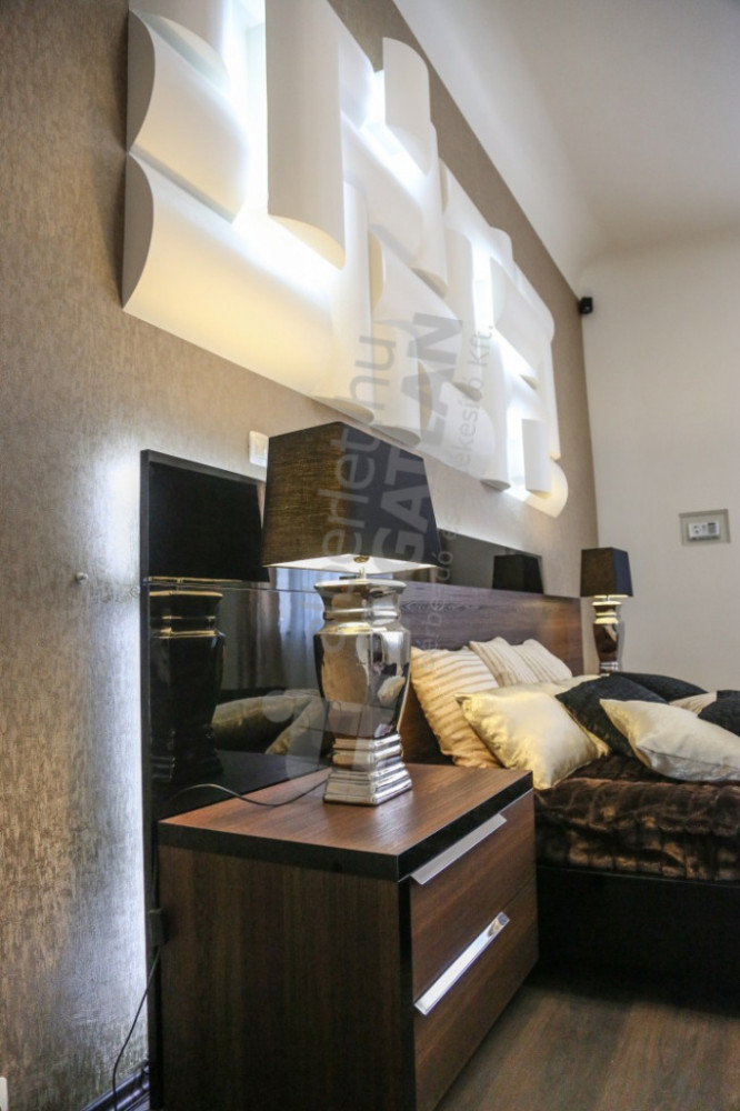Különlegesség a lakásnak az egyedileg ide tervezett gipsz-plasztik lámpák, a padló világítás.