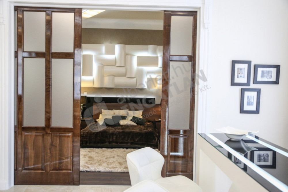 Különlegesség az újra legyártott beltéri juhar nyílászárók melyekhez megtartottuk az eredeti díszes fa ajtó tokokat, az ajtó lapok magas fényűek a tokok matt fehérek.