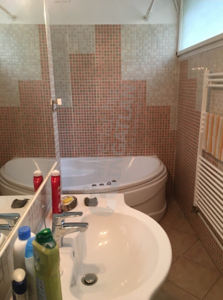 A konyha modern, teljesen gépesített (mosogatógép, sütő, főzőlap, hűtő), a fürdő és a WC külön helyiségben kapott helyet.
