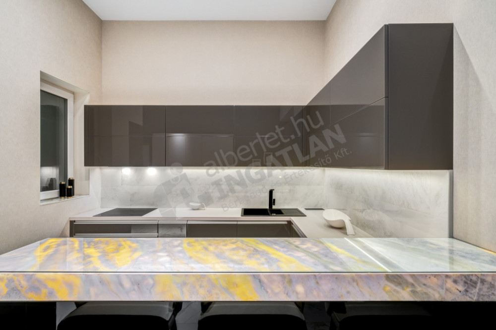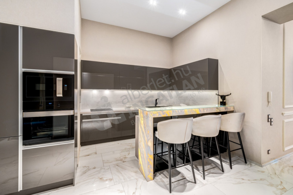 A konyha teljes körűen gépesített (Gorenje, Electrolux és Zanussi készülékekkel), a konyhabútor szintén egyedi tervek alapján készült. A konyhaszigetet lezáró, hideg- és melegfénnyel megvilágított márvány bárpult különleges hangsúlyt ad a térnek.