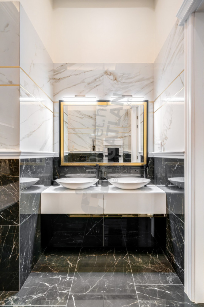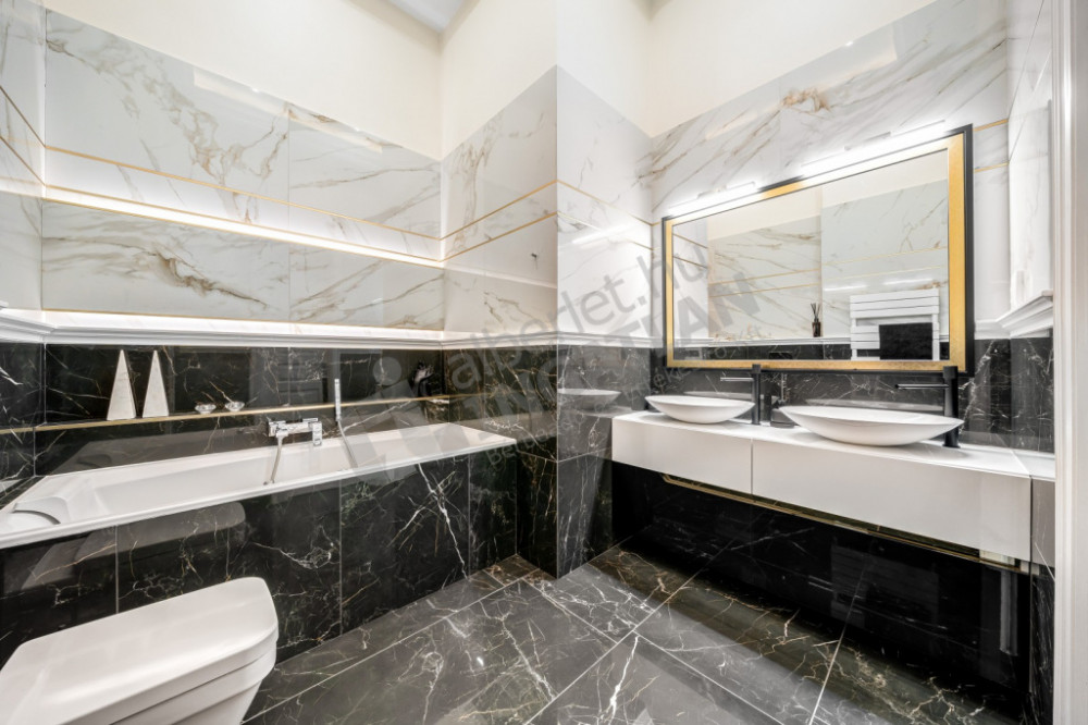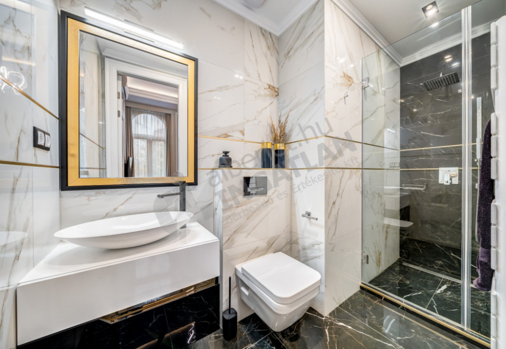 A fürdőszobák prémium minőségű burkolatokkal és szaniterekkel (Grohe, Teka) lettek felszerelve, a tükrök pedig egyedi tervezésűek, kézműves technikával készültek.