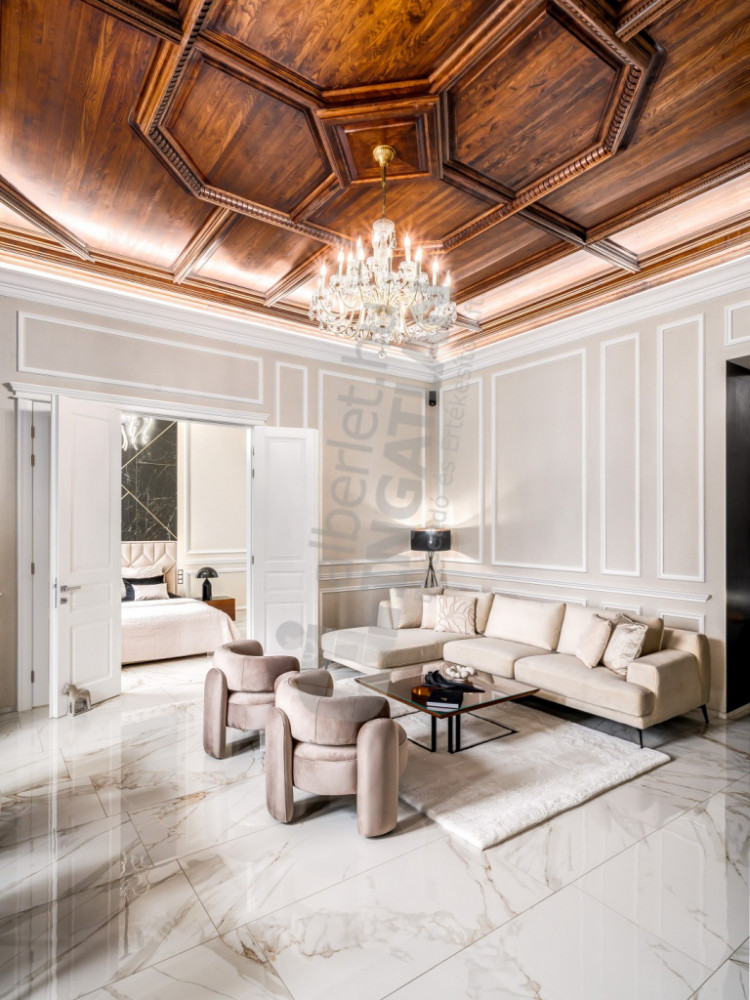 Az otthon egyik leglátványosabb eleme a nappaliban található, egyedileg tervezett és gyártott, pácolt tömör kőrisfa mennyezet. A lakás teljes bútorzata egyedi tervezésű, aprólékos kézimunkával készült. A nappaliból nyíló hálószobák beépített gardróbszekrényei jelentős tárolókapacitást kínálnak.