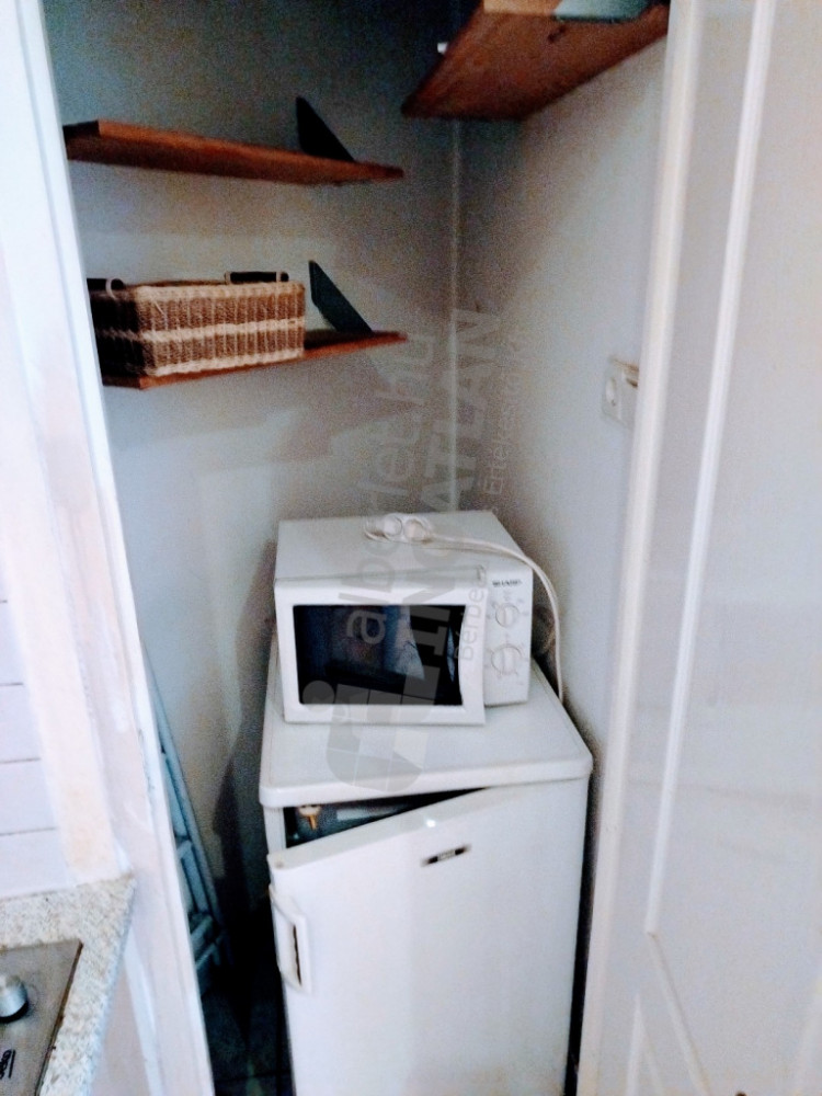 A konyha mellett van egy kis kamra, ahol a kisebb hűtőgép, mikró van elhelyezve. A konyhában elektromos főzőlap van, sütő nincs. A zuhanyzós fürdőszoba és a wc egy légtérben van.