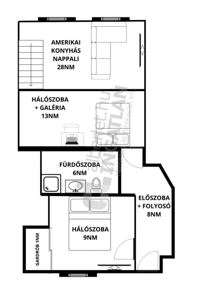 Az 53 m²-es alapterületet egy 12 m²-es, 185 cm belmagasságú galéria egészíti ki, amely praktikus és jól kihasználható plusz teret biztosít – ideális dolgozósaroknak, vendégtérnek vagy tárolásra.