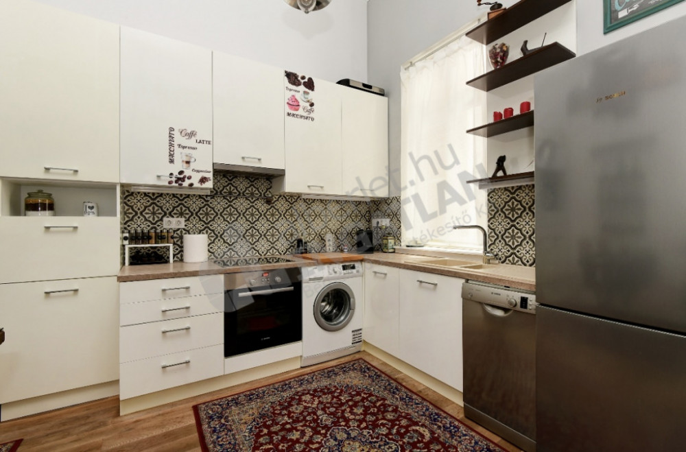 Gépesített konyha. (hűtő + mélyhűtő, mosogatógép, Sütő, kerámia főzőlap, mikró, szagelszívó, kávéfőző)