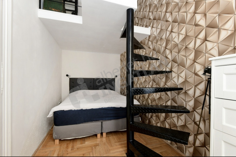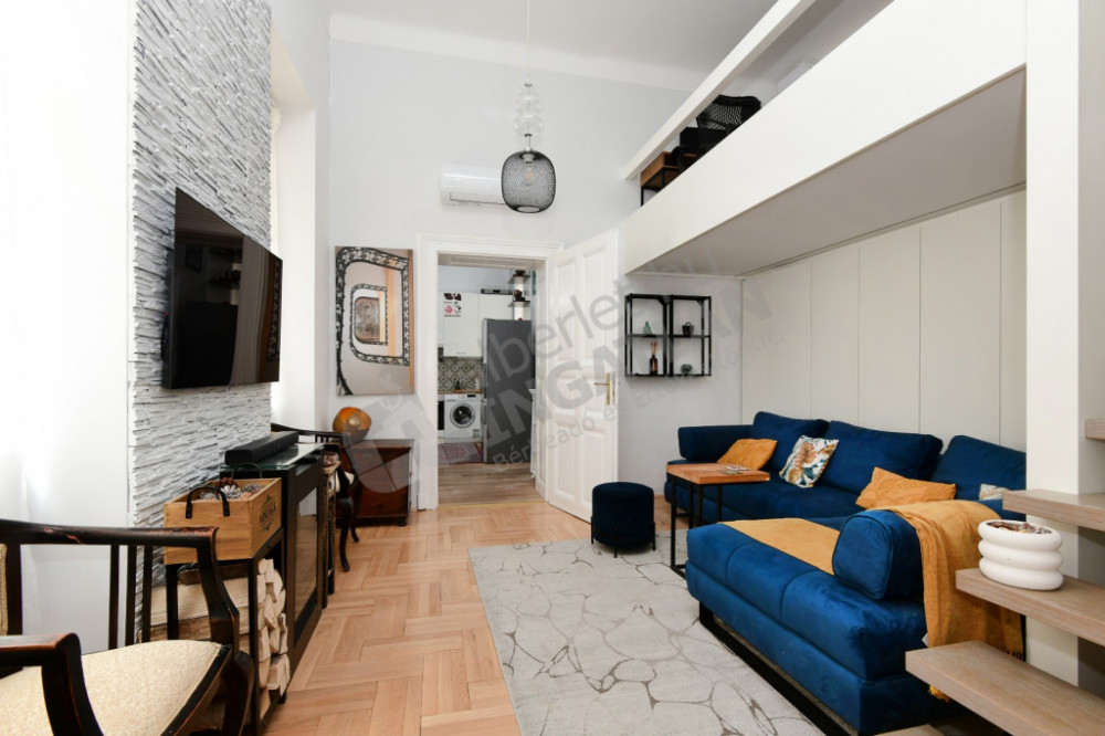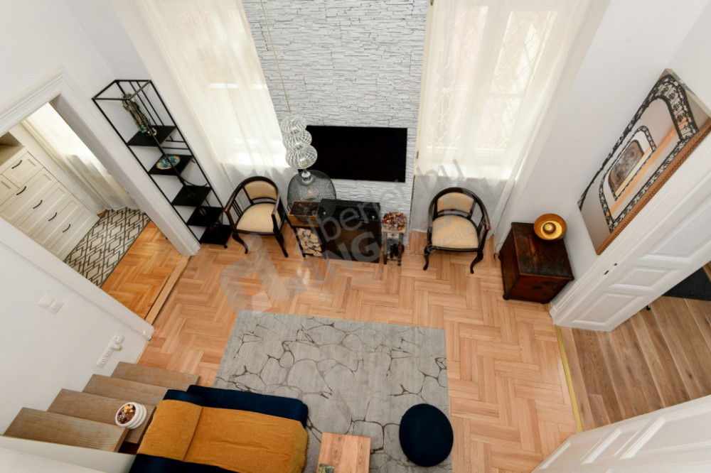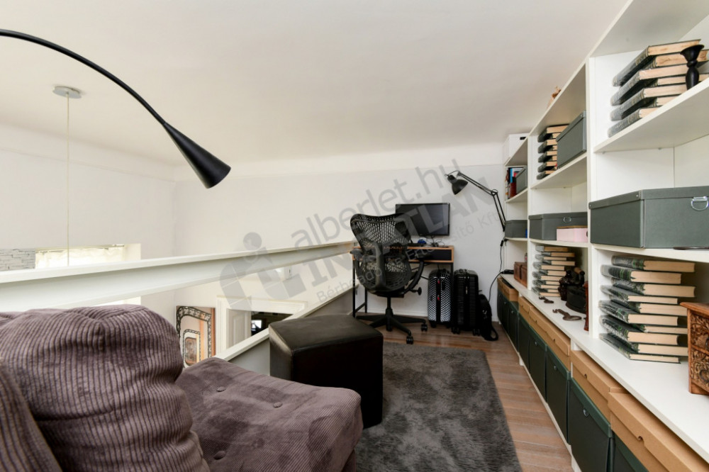 Bútorozott, lakás, galériás nappali, dolgozósarokkal.