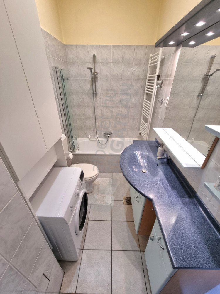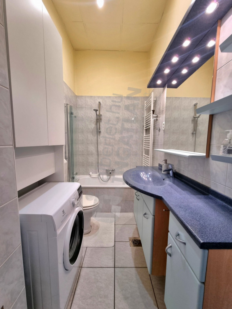 A modern, gépesített amerikai konyha (főzőlap, sütő, elszívó, hűtő, mosogatógép) teljesen felszerelt, a lakás berendezett állapotban kiadó. A fűtést és a melegvizet cirkó rendszer biztosítja, a komfortérzetet légkondicionáló növeli. A fürdőszoba kádas, a lakásban két WC található.
