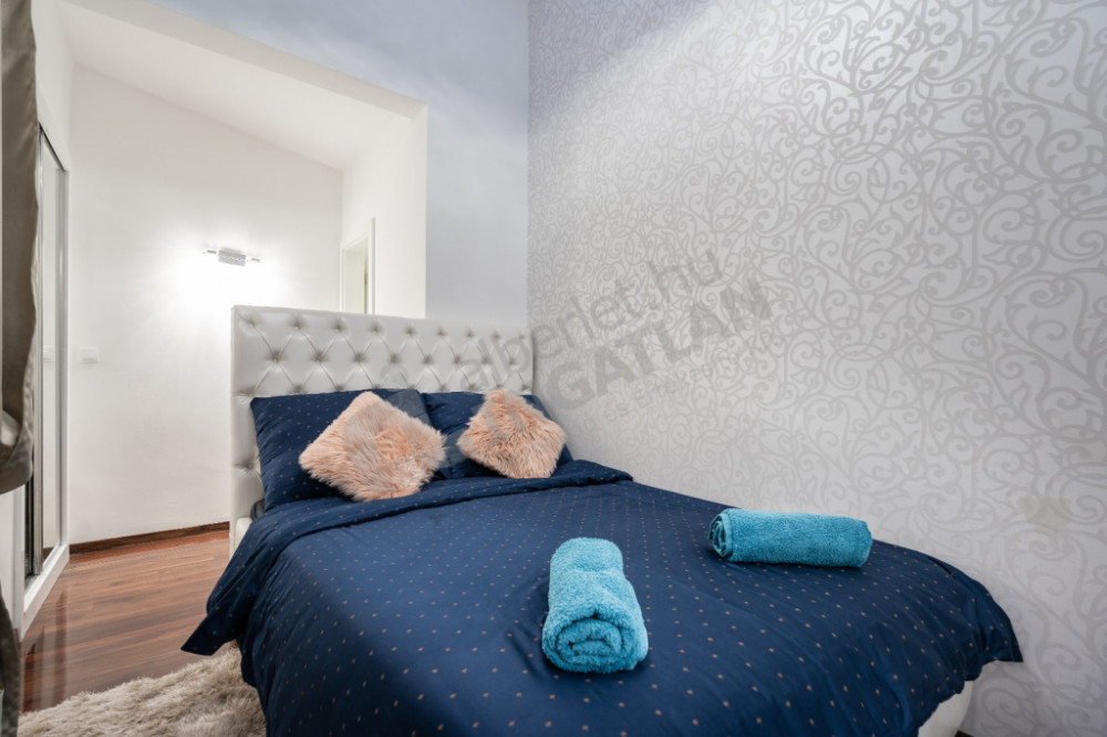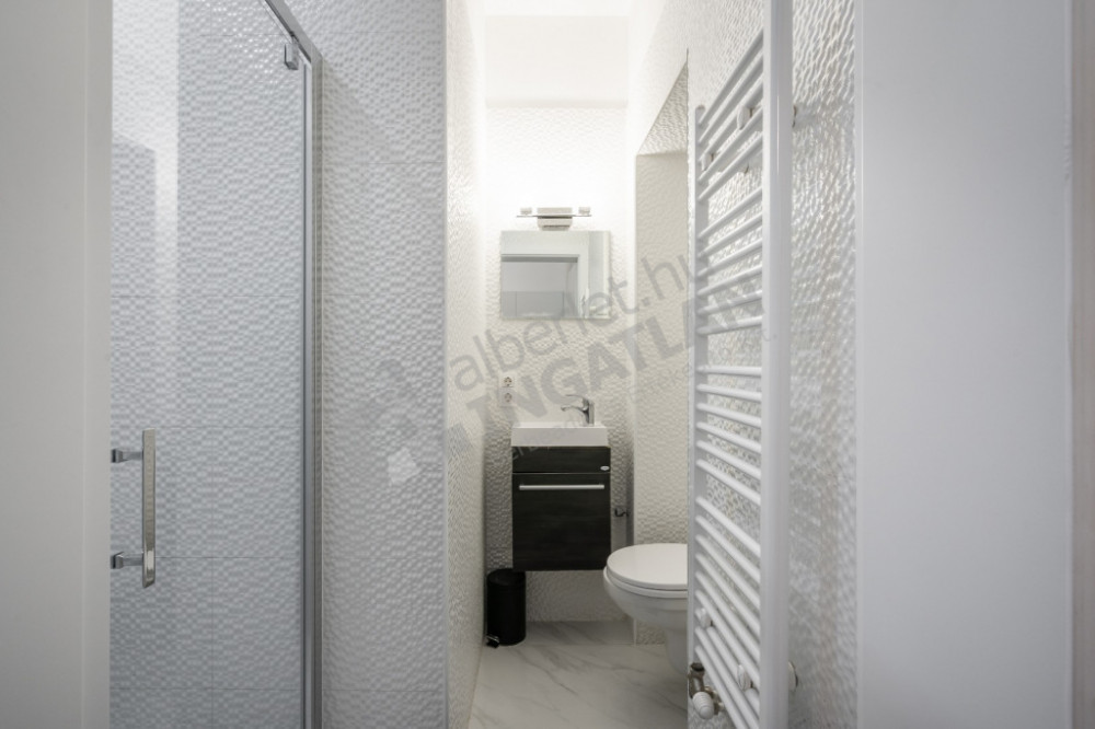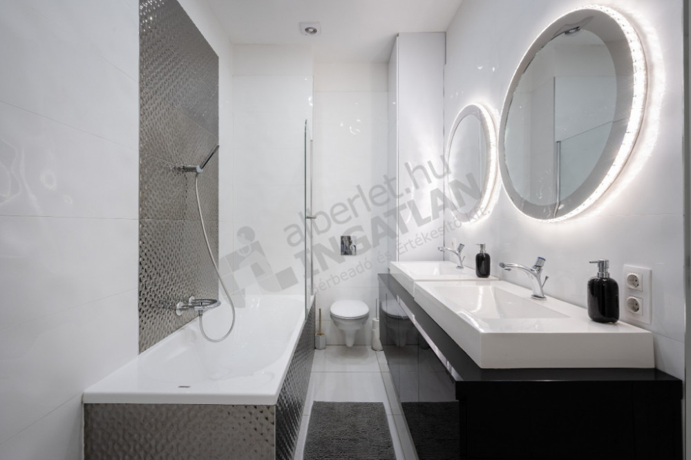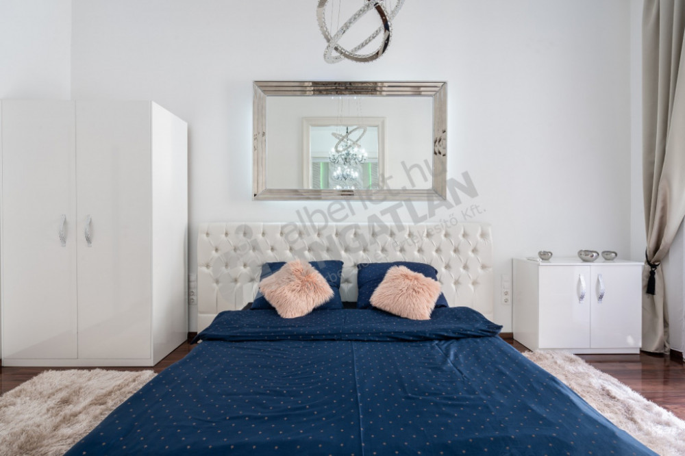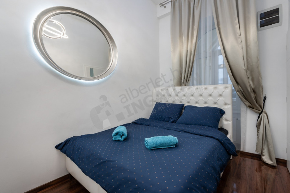 Erkélyes, klímás, teljesen berendezett, két fürdőszoba + vendég WC.