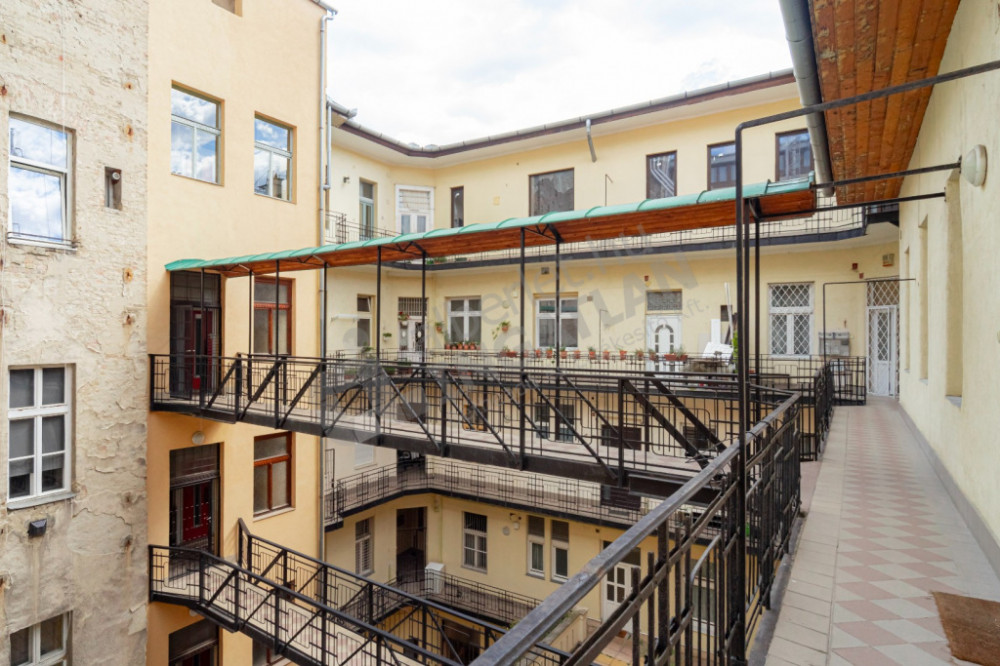 A társasház jó állapotú, liftes, különleges atmoszférával bír, különleges függőfolyosóinak köszönhetően.