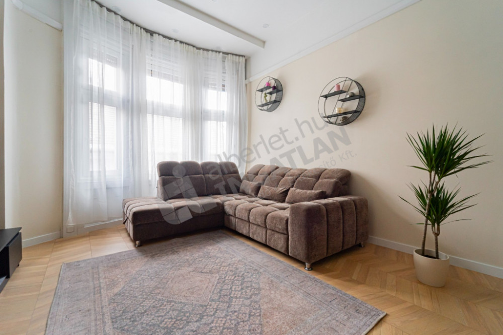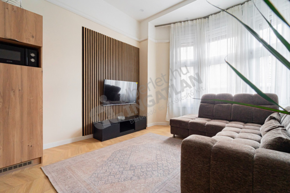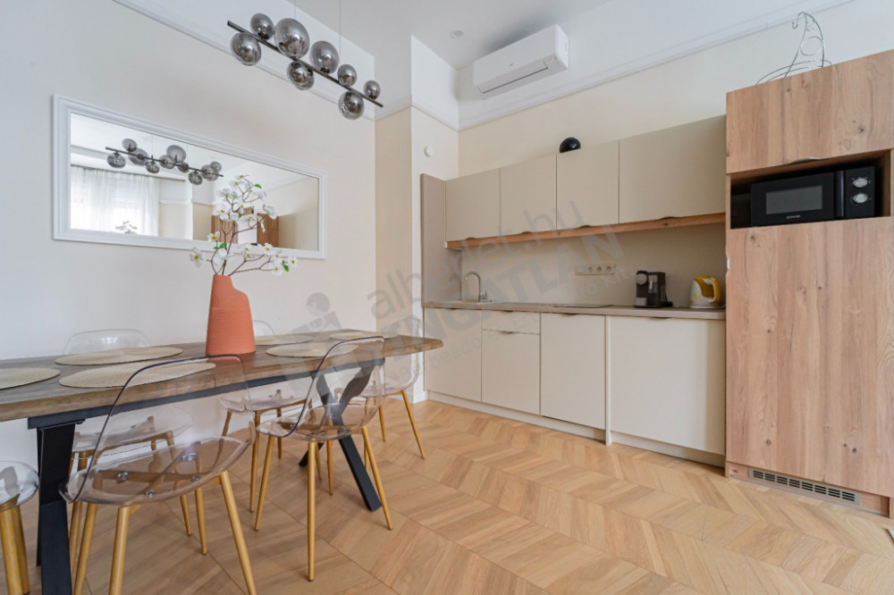 A kiadó ingatlan tavaly került minőségi felújításra a tulajdonos által, egy nagyméretű lakás lett felosztva 3 kisebb lakásra, a lakások közös előtérből nyílnak, melyből jelen lakás 60m2-es, teljesen bútorozott, berendezés rendkívül ízléses, igényes, gépesítés szempontjából teljesen felszerelt, beleértve a mosogatógépet is.