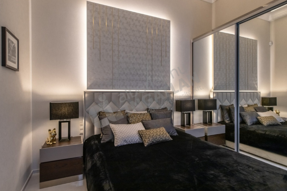 Az amerikai konyhának köszönhetően az amúgy is tágas nappali még nagyobbnak tűnik. A nappaliban és hálószobákban az egyedi tervezésű bútorok kerültek.
