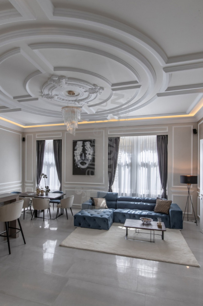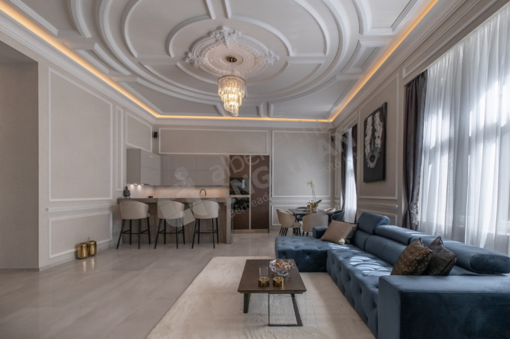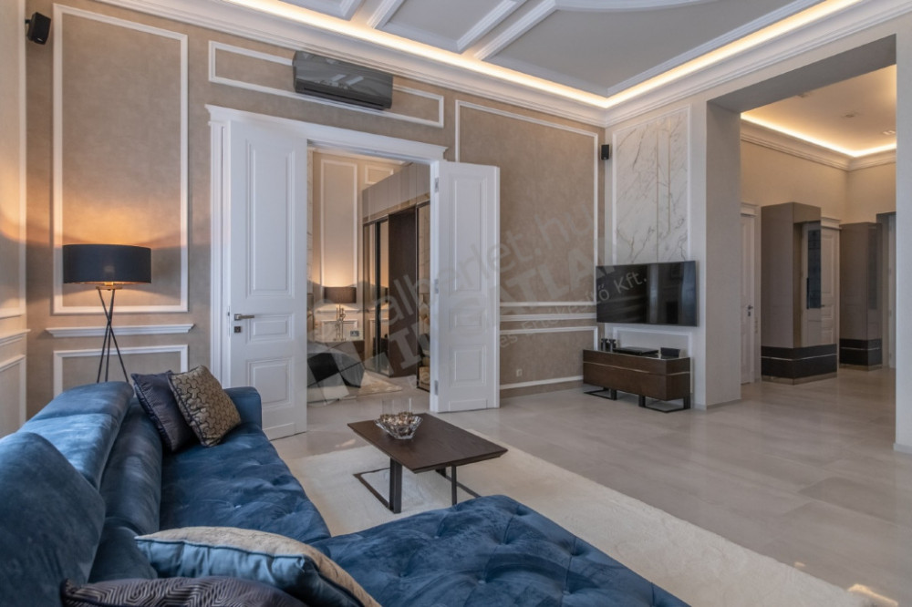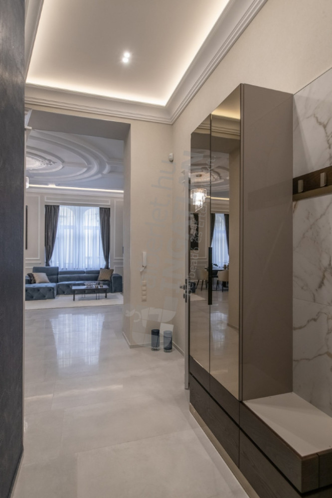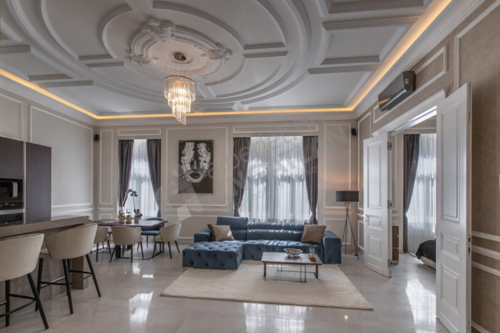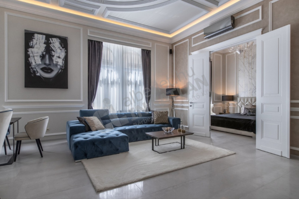 A lakás legszembetűnőbb különlegessége az egyedileg ide tervezett és gyártott gipszmennyezet a nappaliban és a hálószobákban, valamint a polgári hangulatot idéző gipszkazetták az oldalfalakon, amik mind egyedi kézmunkával készültek.
