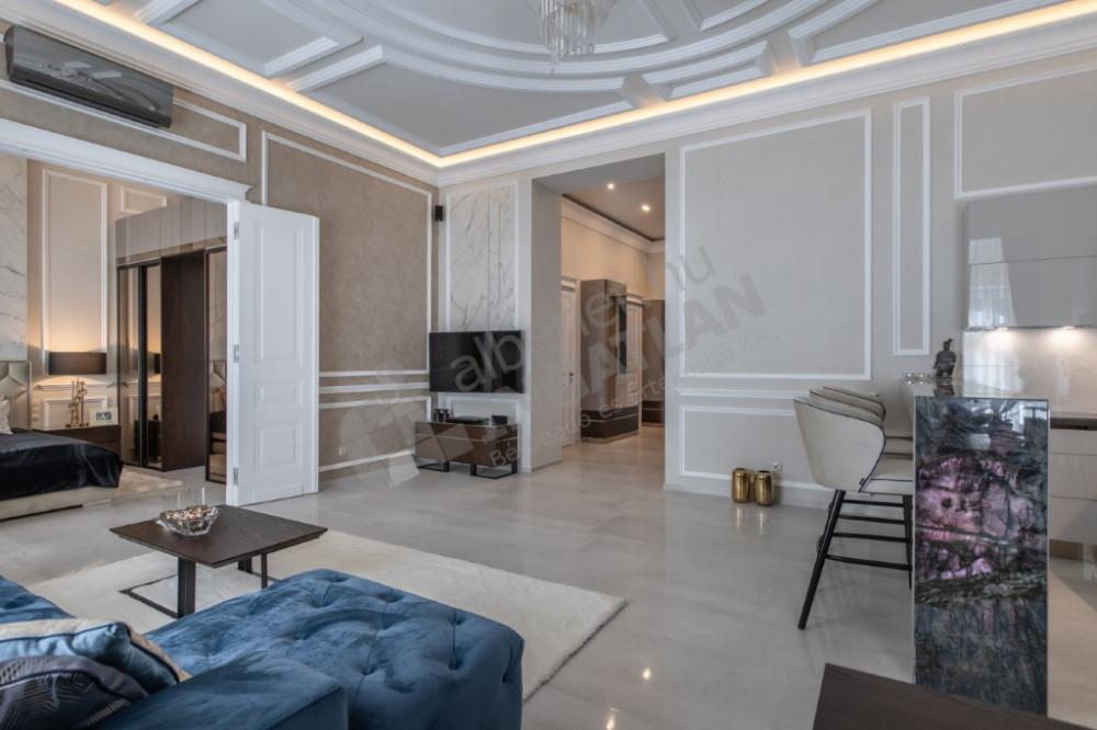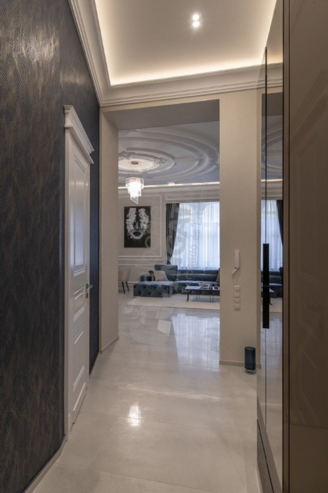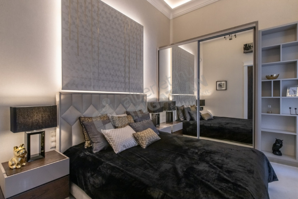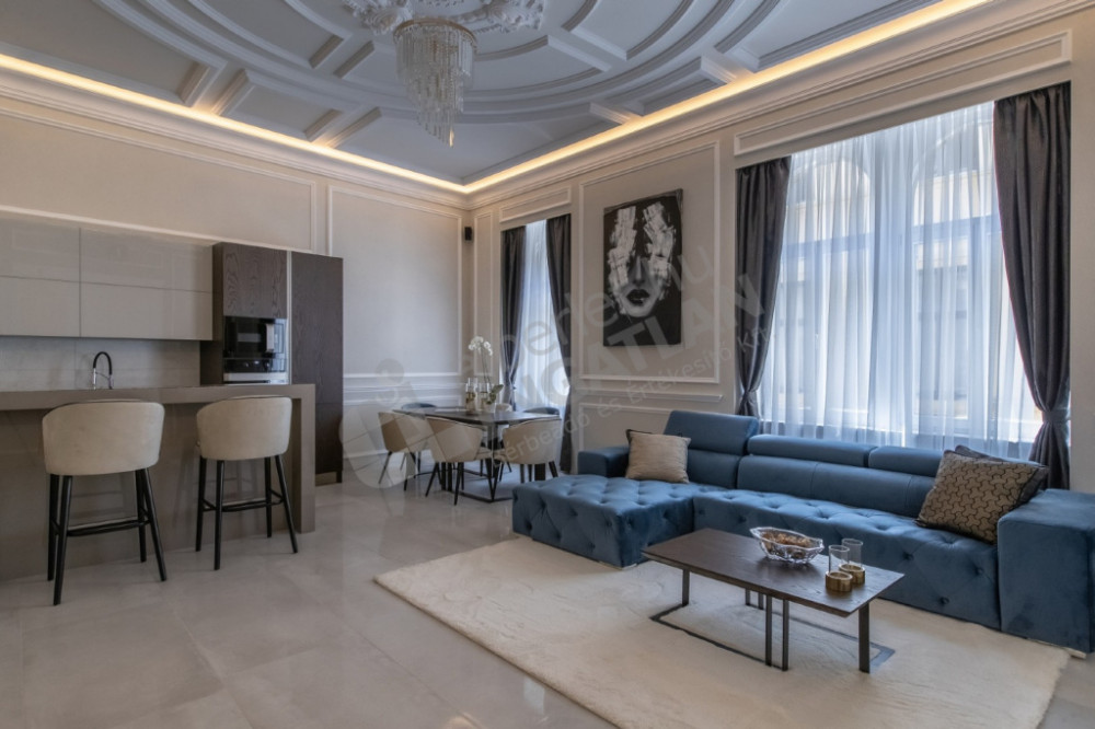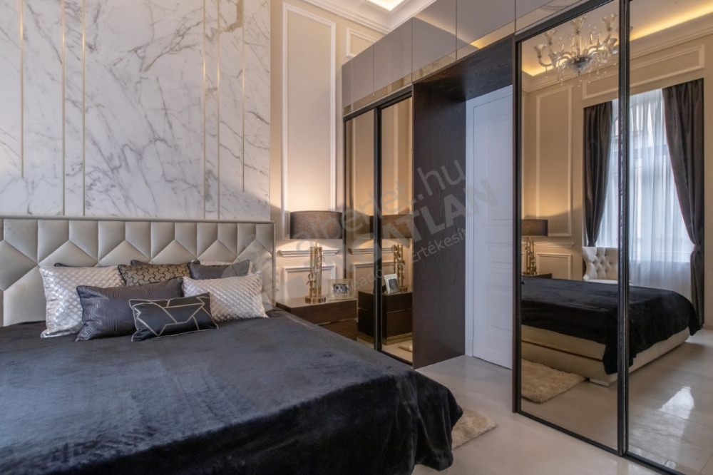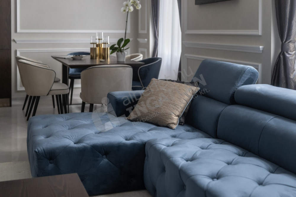 A lakás legszembetűnőbb különlegessége az egyedileg ide tervezett és gyártott gipszmennyezet a nappaliban és a hálószobákban, valamint a polgári hangulatot idéző gipszkazetták az oldalfalakon, amik mind egyedi kézmunkával készültek.