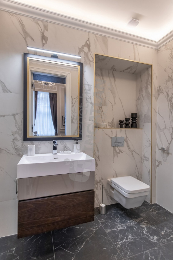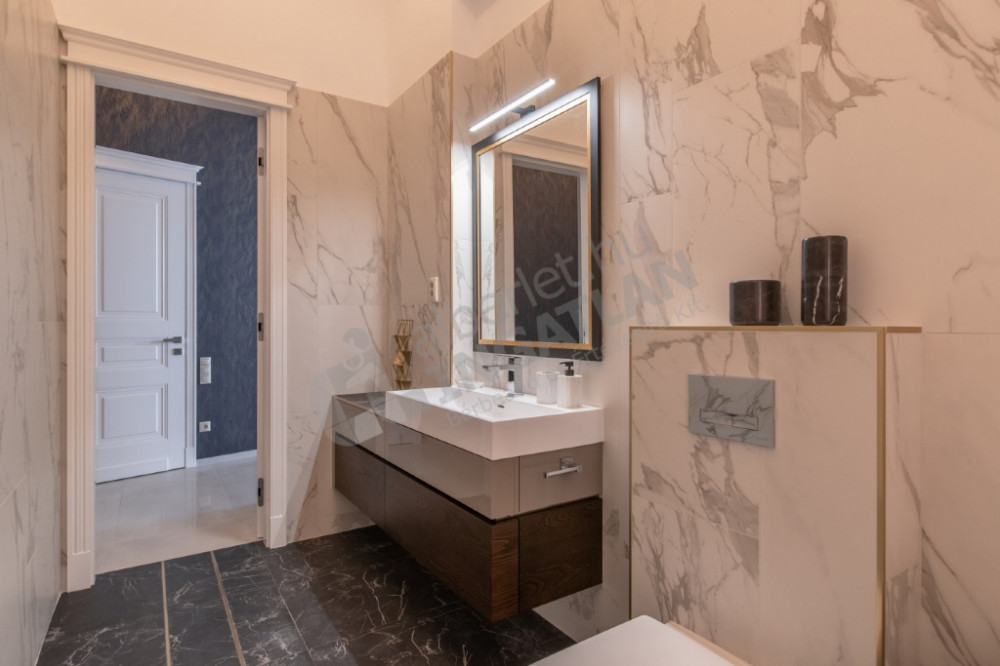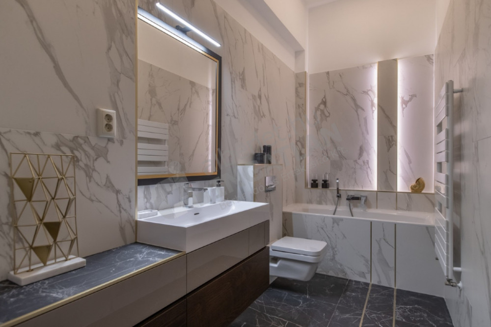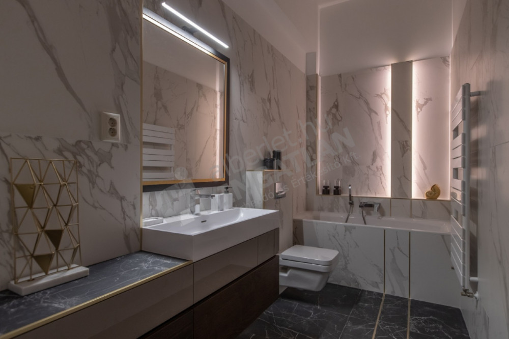 A fürdőszobákba magas minőségű burkolatok és szaniterek (Grohe, Villeroy& Boch) kerültek kiválasztásra, továbbá a tükrök is egyedi tervek alapján, kézműves technikával készültek.