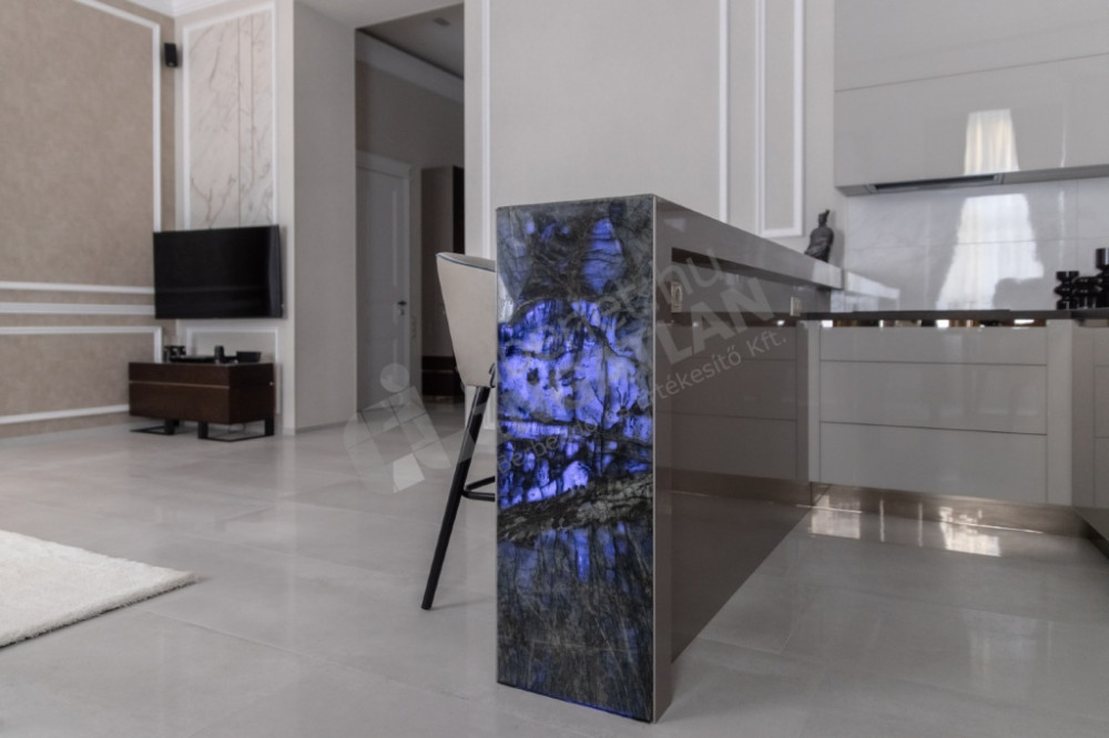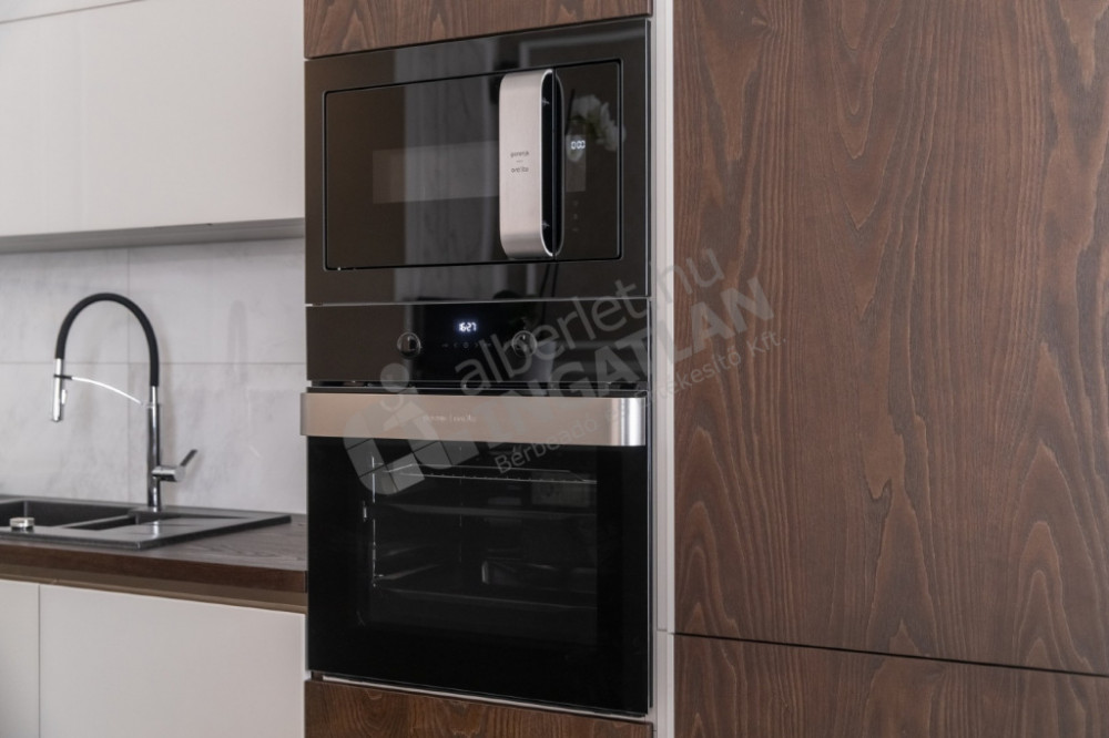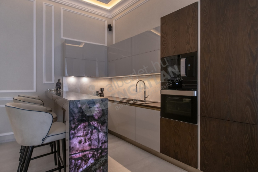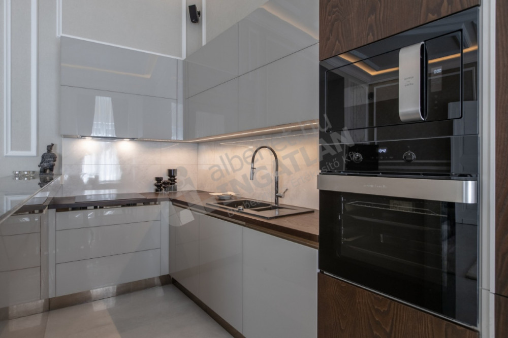 A konyha teljesen felszerelt és gépesített, a konyhabútor szintén egyedi tervek alapján készült.