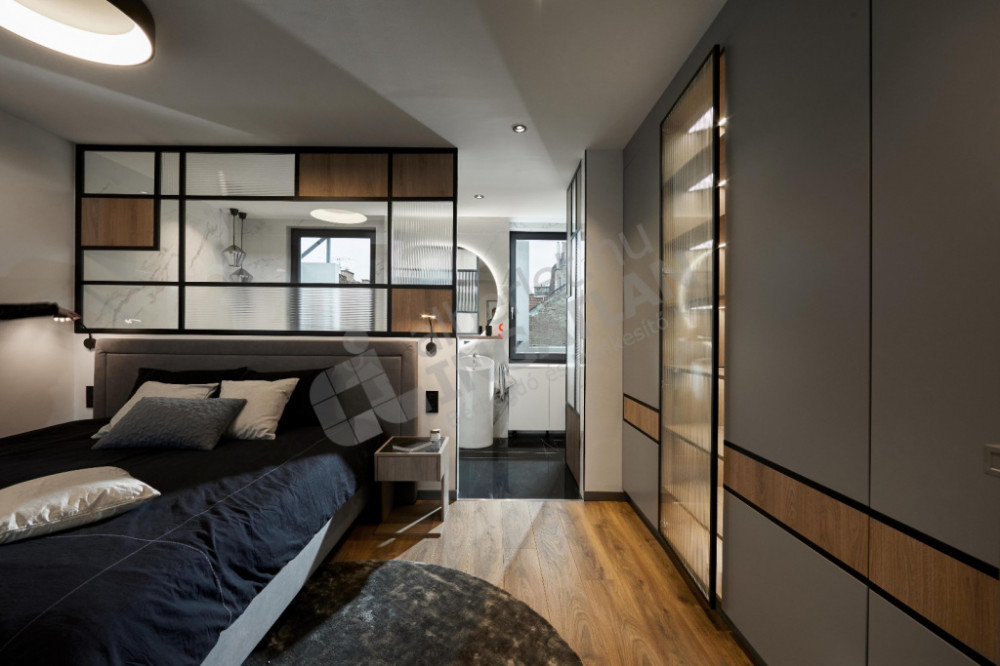 A hatalmas ablakok – árnyékolókkal ellátva - különösen világossá teszik a lakást.