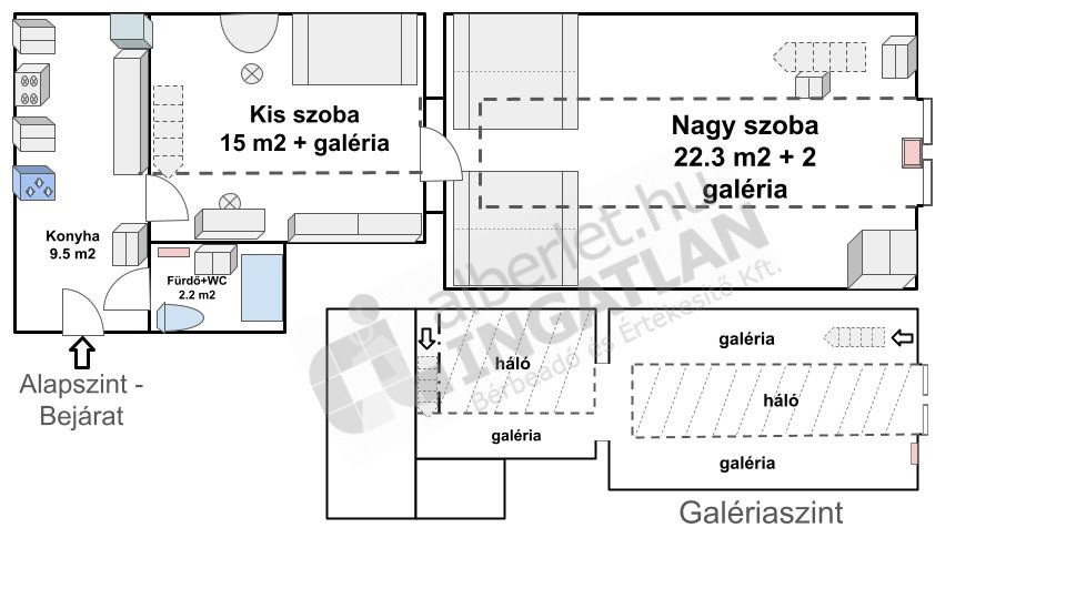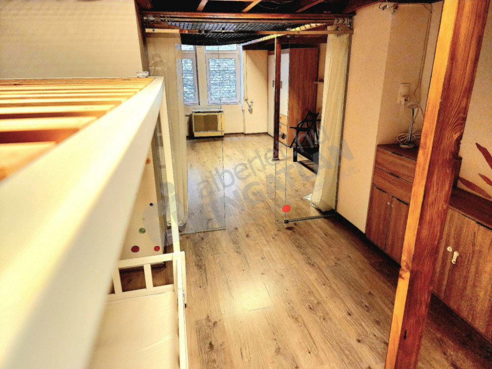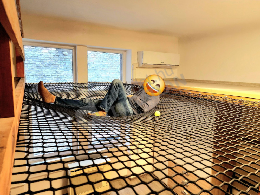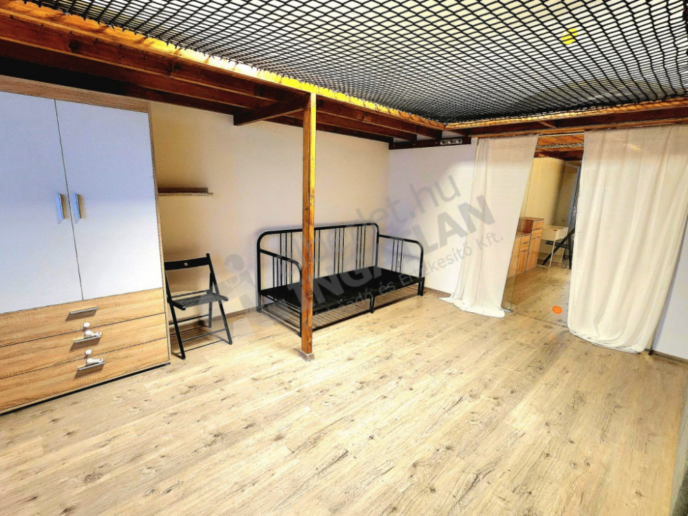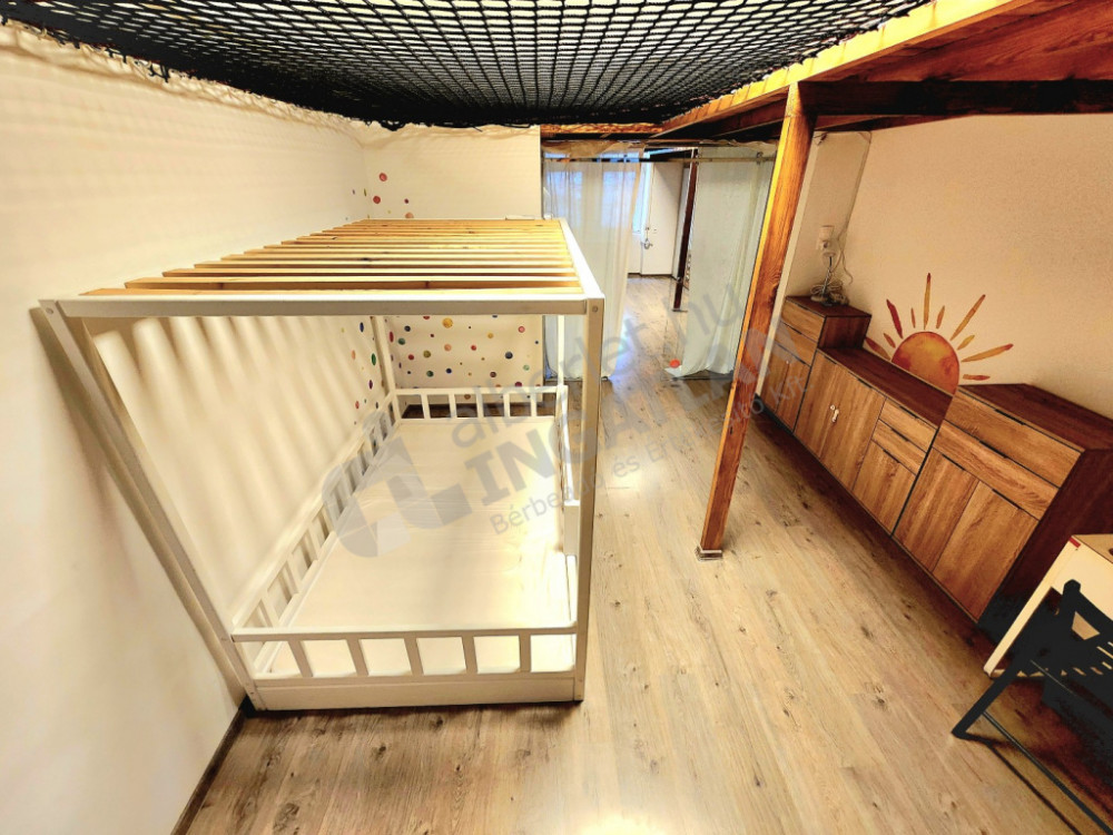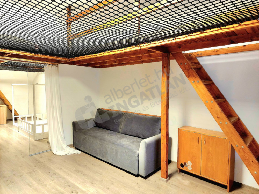 Kiadó egy 49 m²-es, modern, 2 szobás téglalakás, üveg tolóajtóval elválasztva, amelyet egy játékosan kialakított, 38 m²-es védőhálós fekvőgaléria egészít ki – maximális térkihasználás, különleges hangulat.