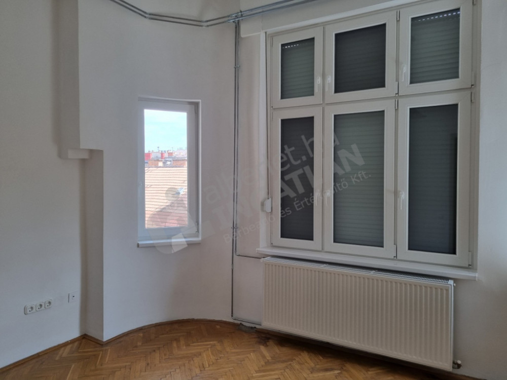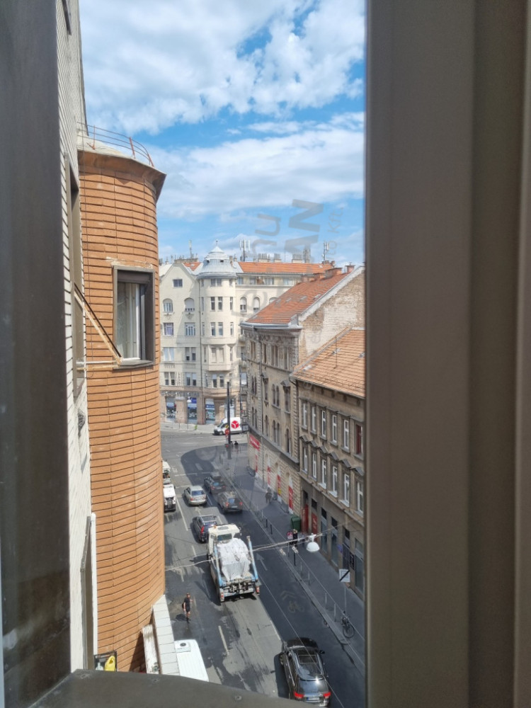 Negyedik emeleti, világos, utcára néző ablakok, liftes épületben.