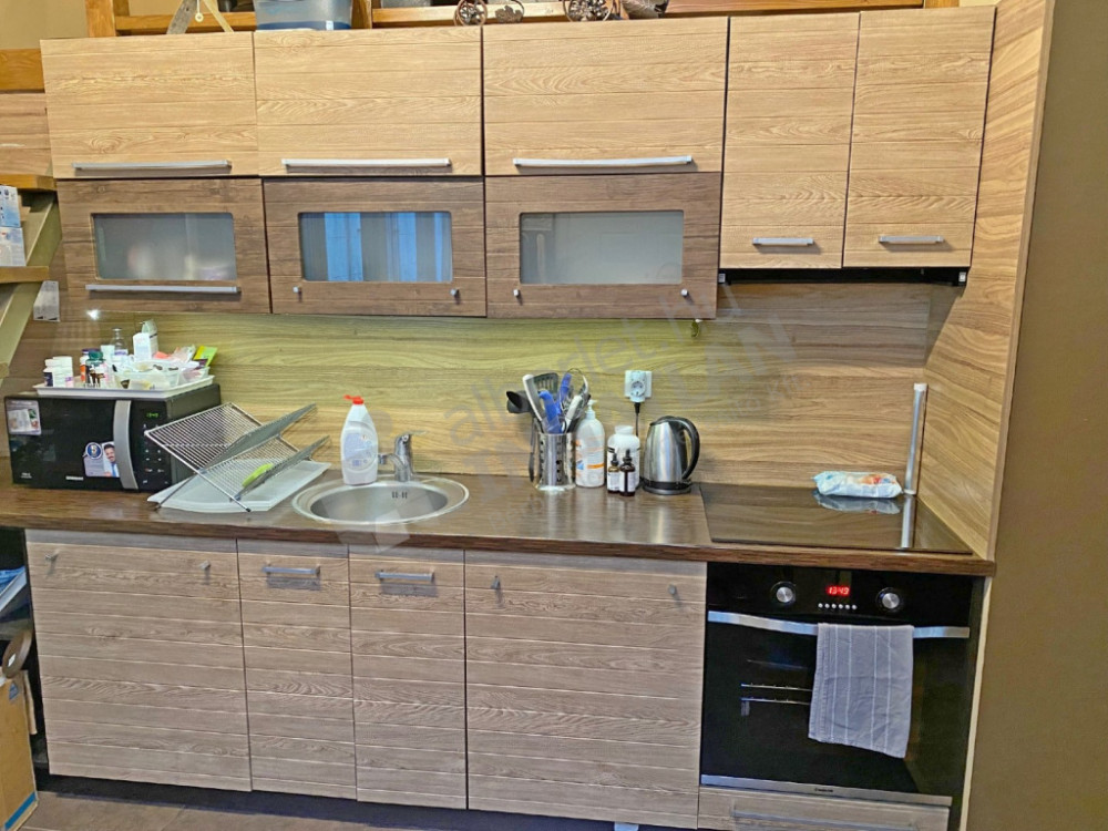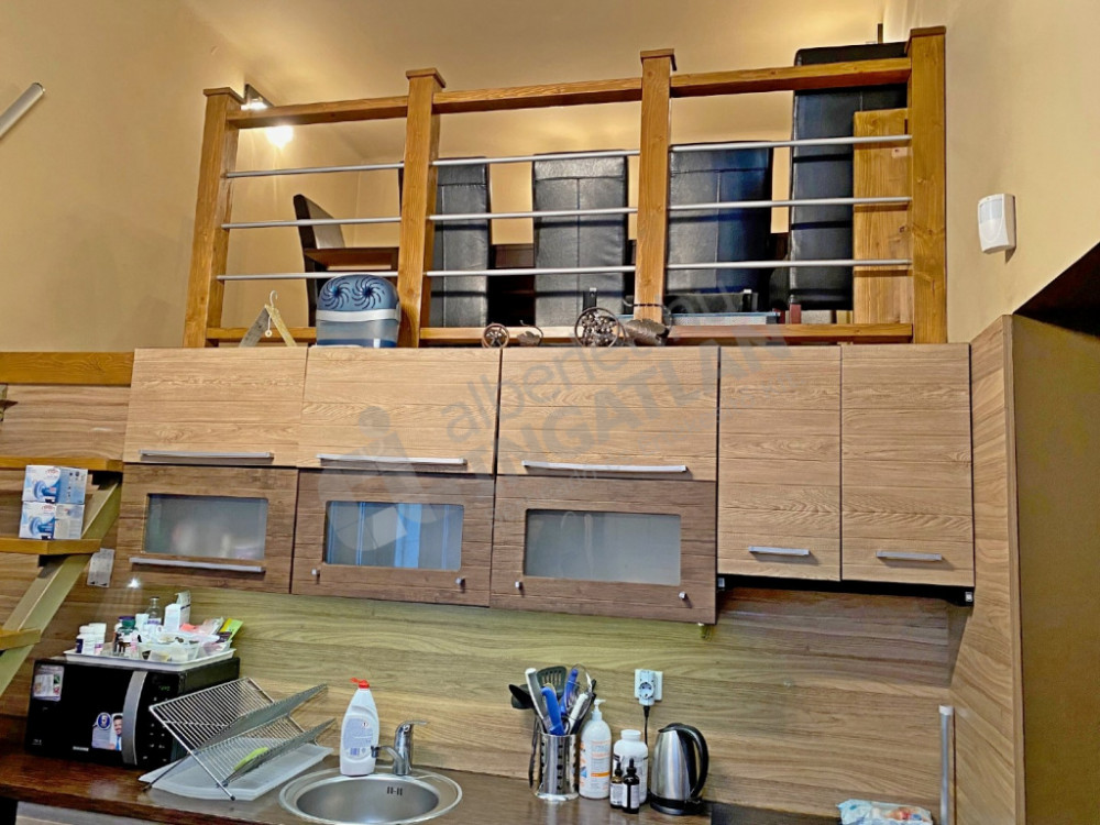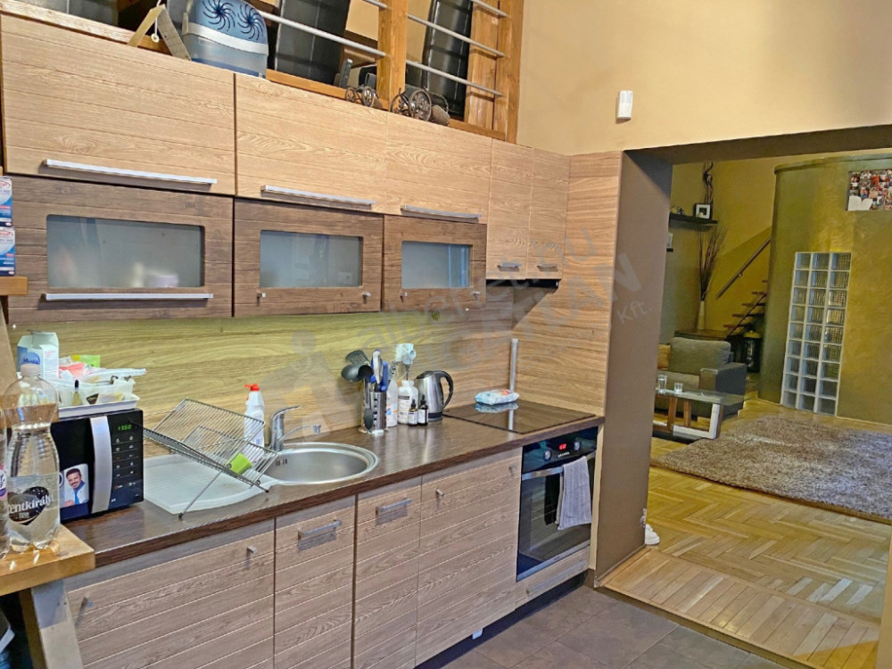 Az előtérben a konyha, ami felett GALÉRIA, itt van az étkező.