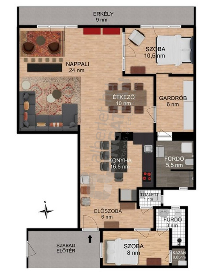 -Elrendezés: 3 külön nyíló szoba, tágas gardrób, modern konyha–étkező, 2 fürdőszoba és külön WC