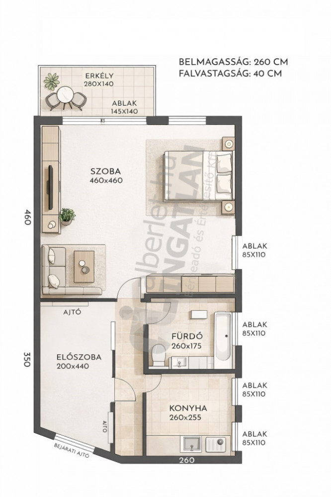 A lakás NEM UTCÁRA, HANEM VÉDETT, BELSŐ RÉSZRE NÉZ, így a forgalom zaja nem hallatszik be – nyugodt, élhető környezetet biztosít.