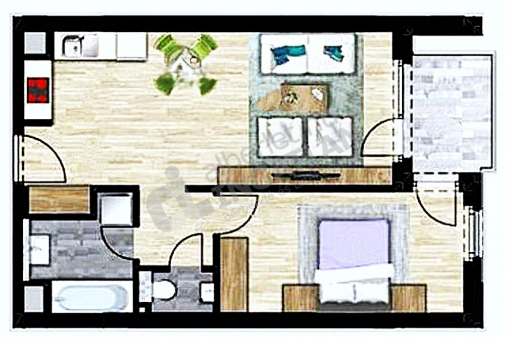Tágas amerikai konyhás nappali, külön hálószoba, mindkét helyiségből kijárattal az erkélyre.