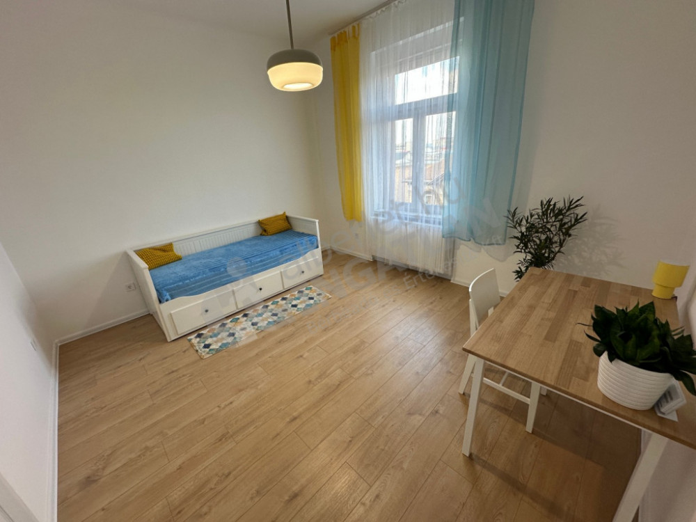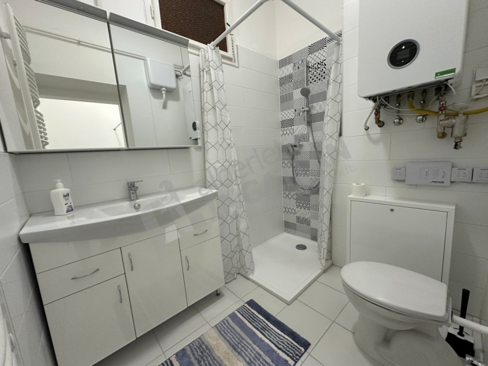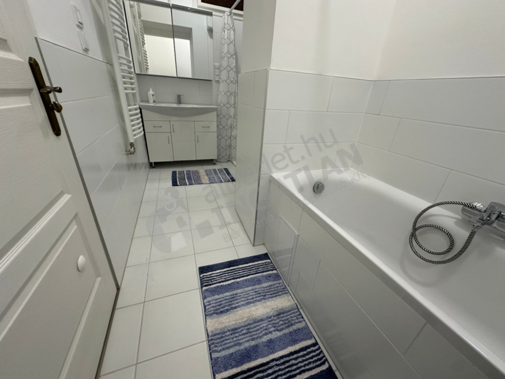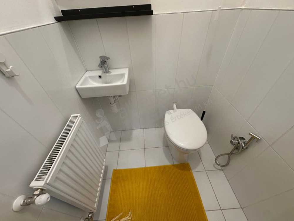 A fürdőszobában zuhanyzó és kád is van, és még egy WC. Utcafrontra nyílik a két nagyméretű szoba.