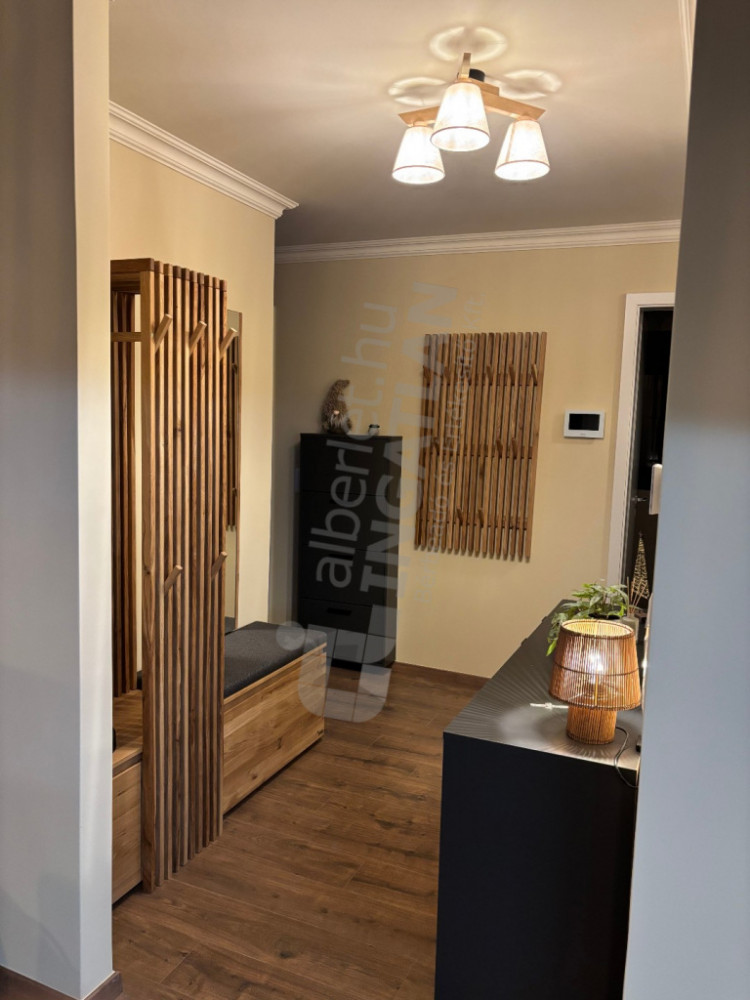 Elosztás: 7m2 előszoba, 31m2-es amerikai konyhás nappali, 12m2-es terasz, két teljes értékű, 11m2-es hálószoba + gardróbszoba, 7m2-es, dupla mosdós, kádas fürdőszoba, külön WC, 15m2-es szülői háló, melyhez 6m2-es gardrób, és egy másik fürdőszoba is tartozik.