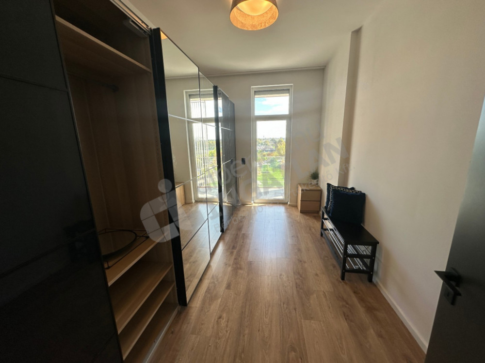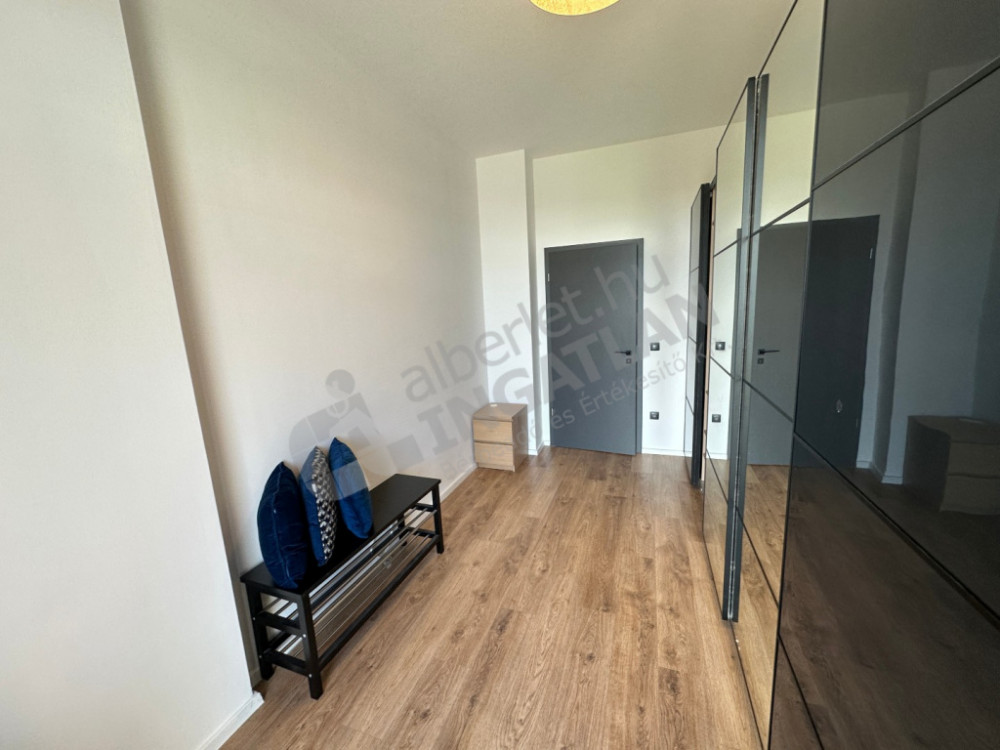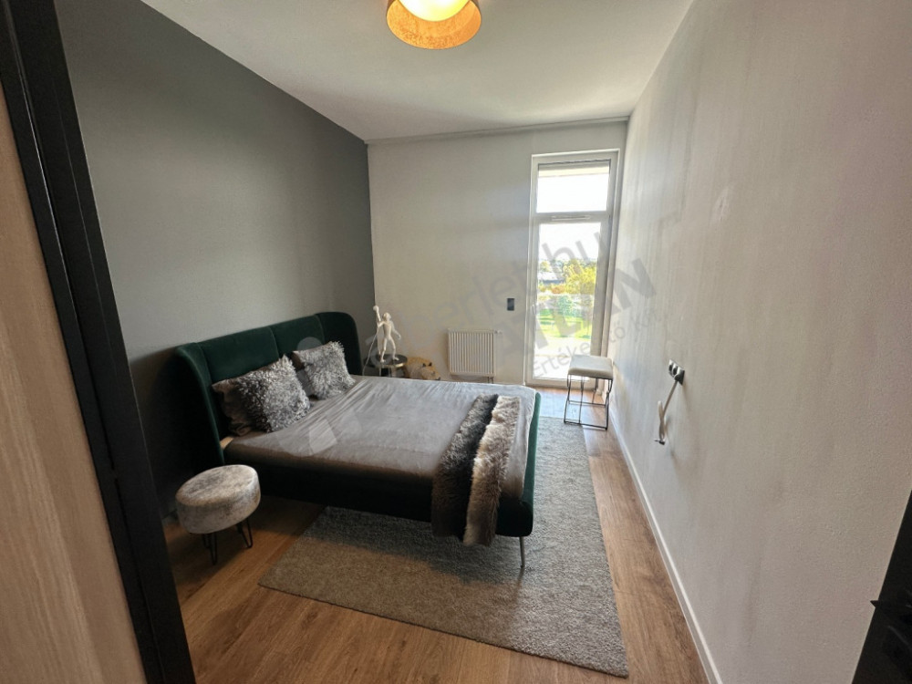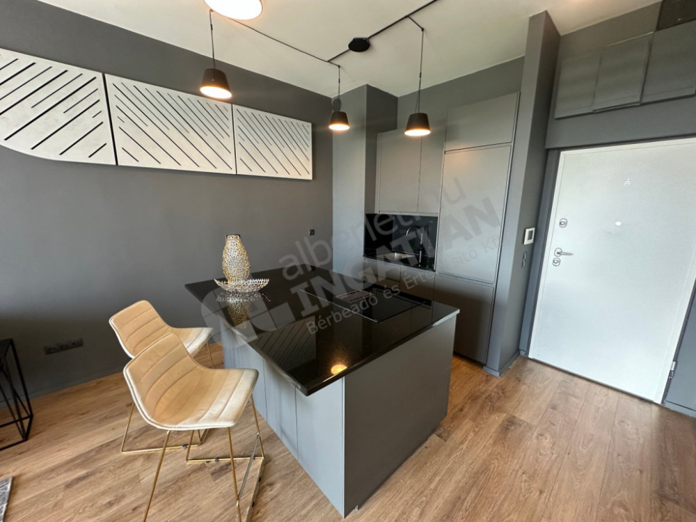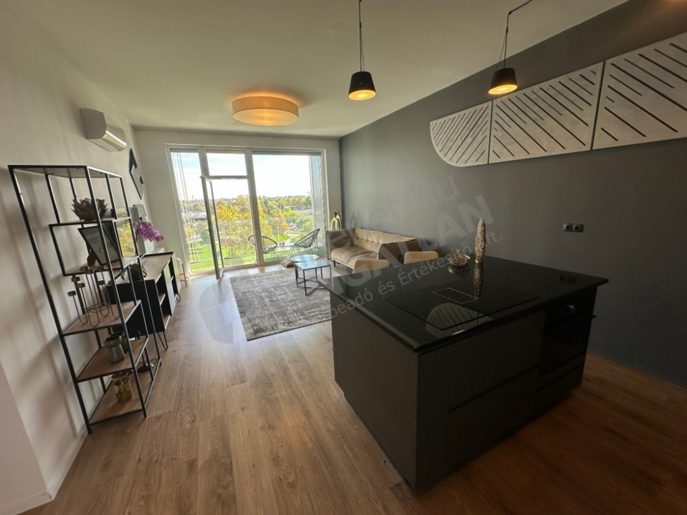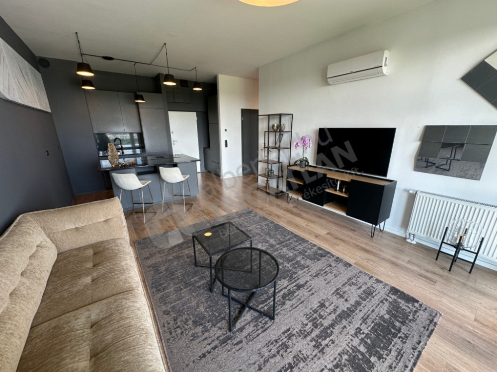 Tágas, világos, igényes bútorokkal berendezett lakás, amerikai konyhás nappalival és két hálószobával.