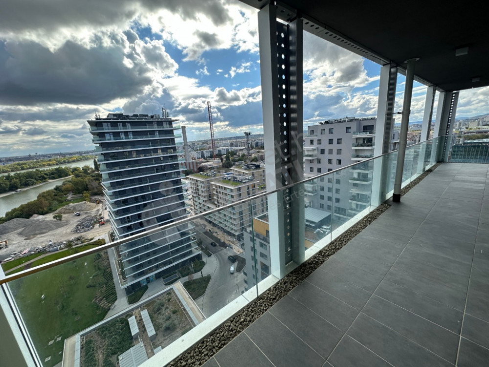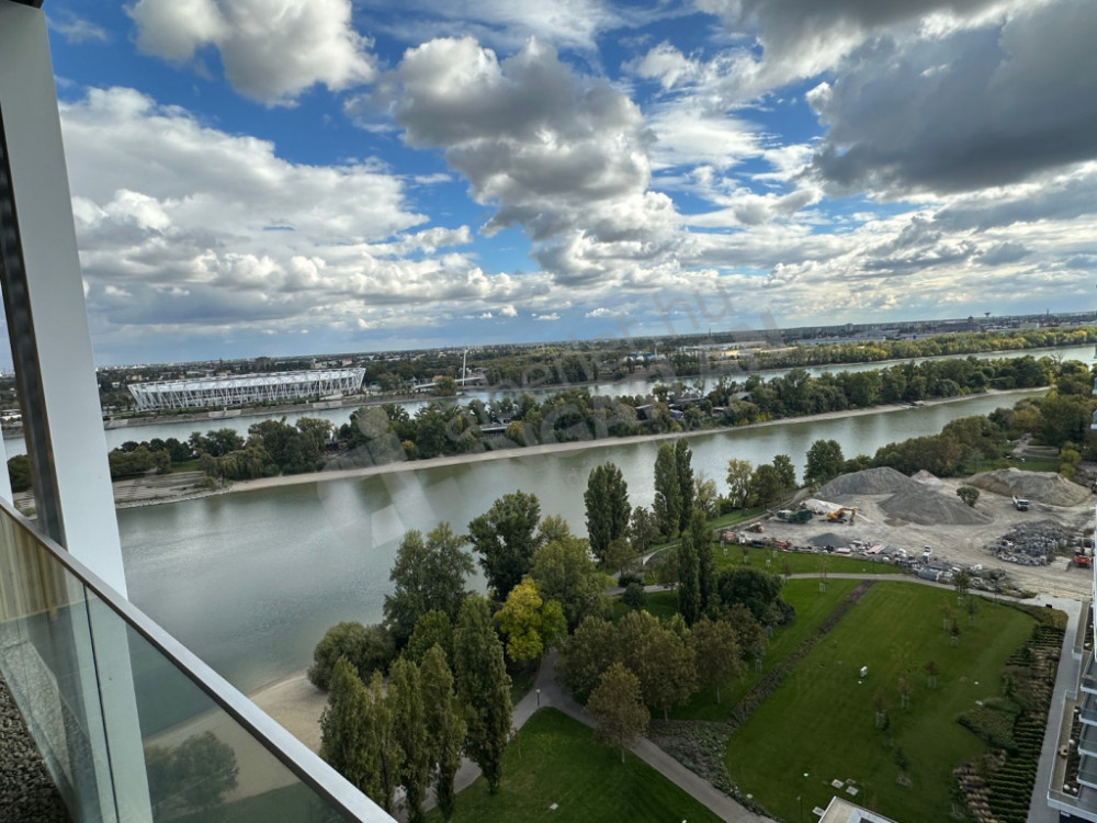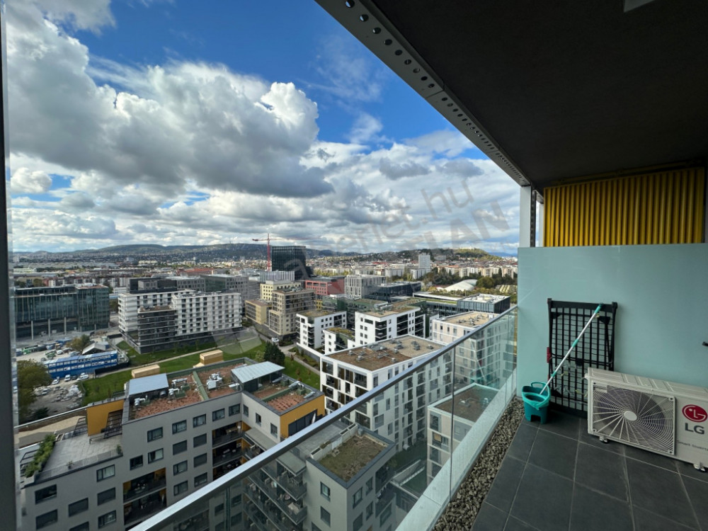 16. emeleti, gyönyörű panorámás, L alakú, 40m2-es erkéllyel, egész nap napos.