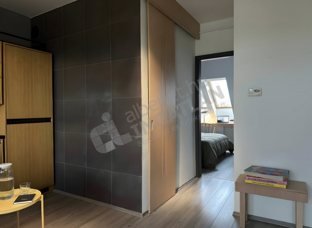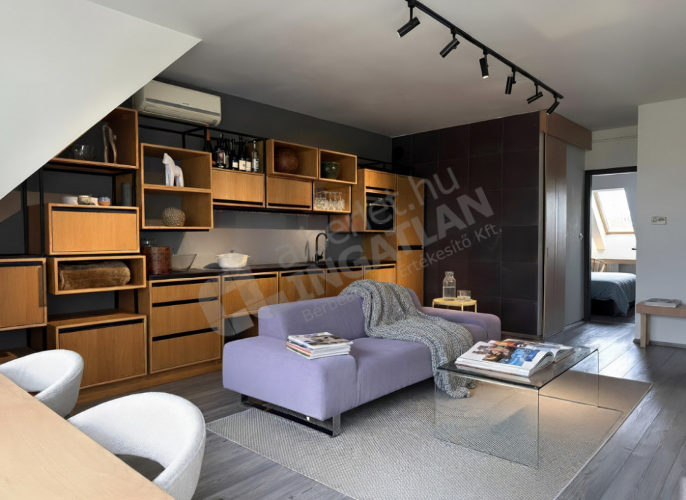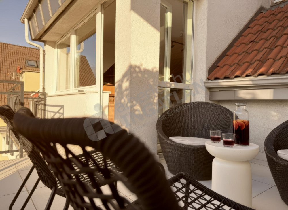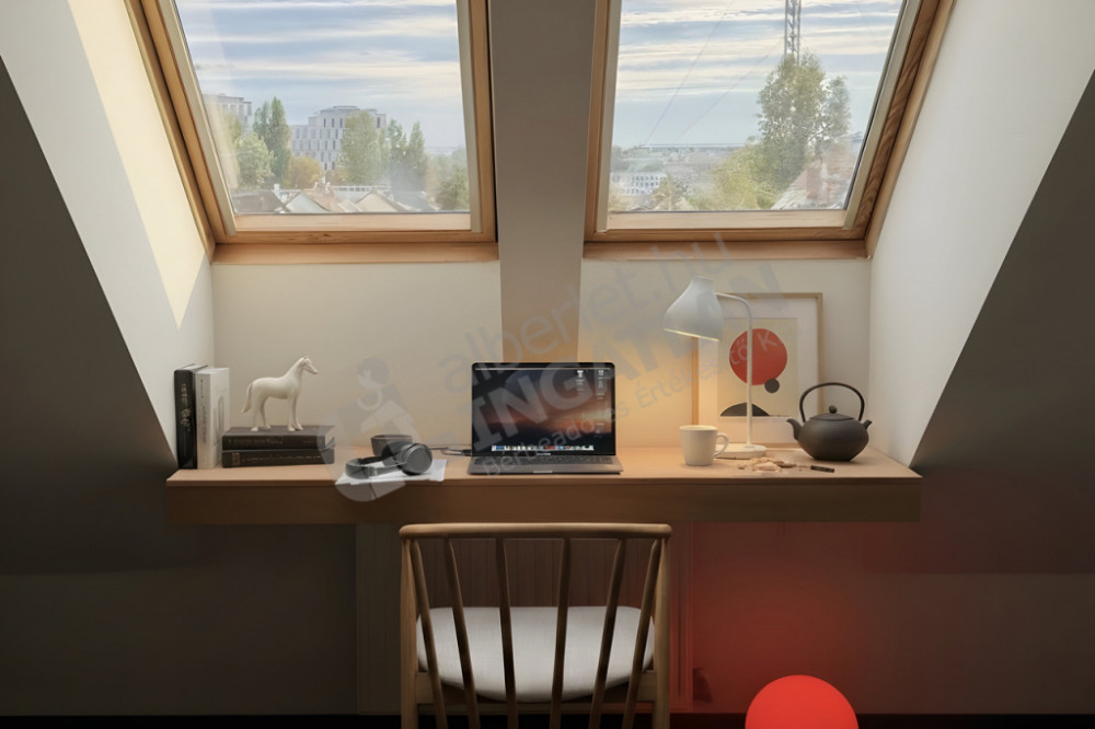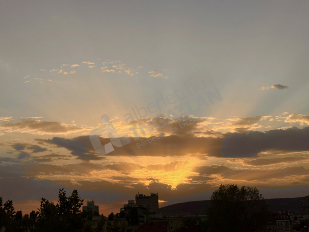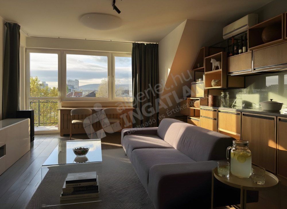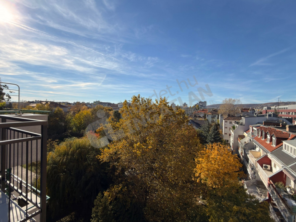A XI. kerület frekventált, mégis csendes, zöldövezeti részén kiadó egy 55 m²-es lakás + 14 m²-es panorámás terasz, a ház legfelső emeletén. A lakás két irányba nyitott, 180°-os zavartalan kilátással: egyik oldalon a budai hegyekre és a zárt, fás belső kertre, másik irányban pedig a városra néz.